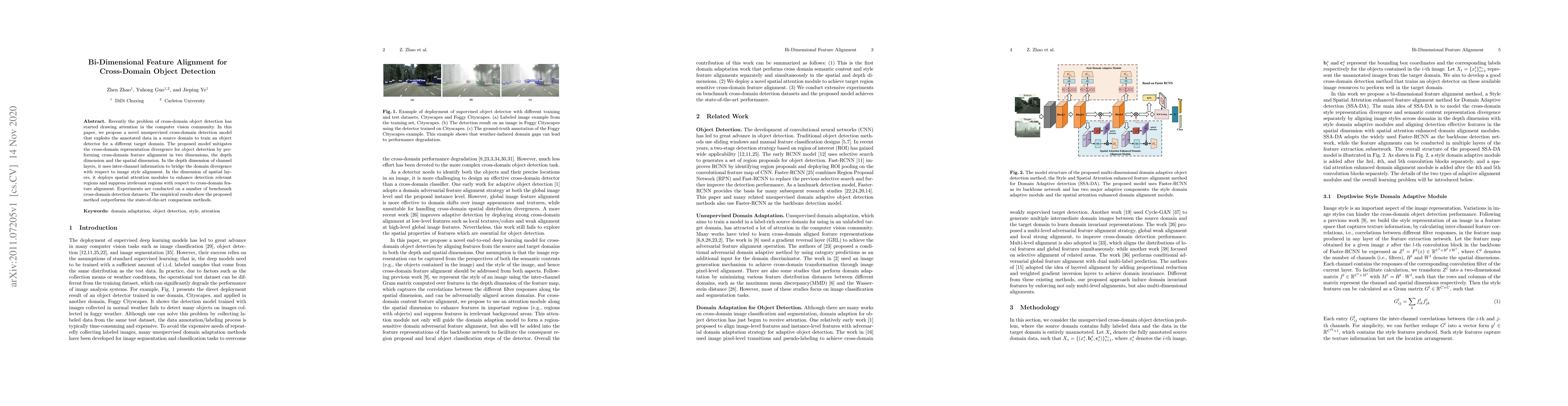 This paper proposes a novel unsupervised model for cross-domain object detection, leveraging source domain annotations to train detectors for target domains. It achieves feature alignment in depth and spatial dimensions to mitigate representation divergence, outperforming state-of-the-art methods on benchmark datasets.