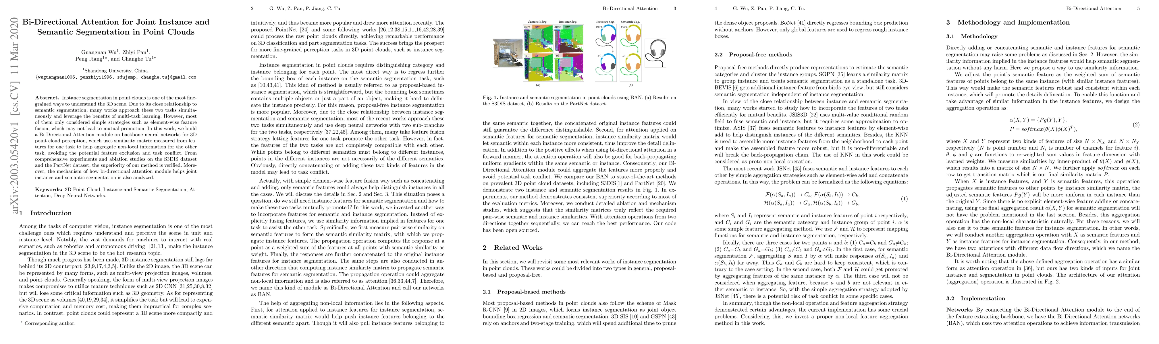This paper proposes a Bi-Directional Attention module for joint instance and semantic segmentation in 3D point clouds, enhancing feature aggregation through mutual promotion between tasks. Experimental results on S3DIS and PartNet datasets demonstrate the method's effectiveness, with an analysis of how bi-directional attention improves task synergy.