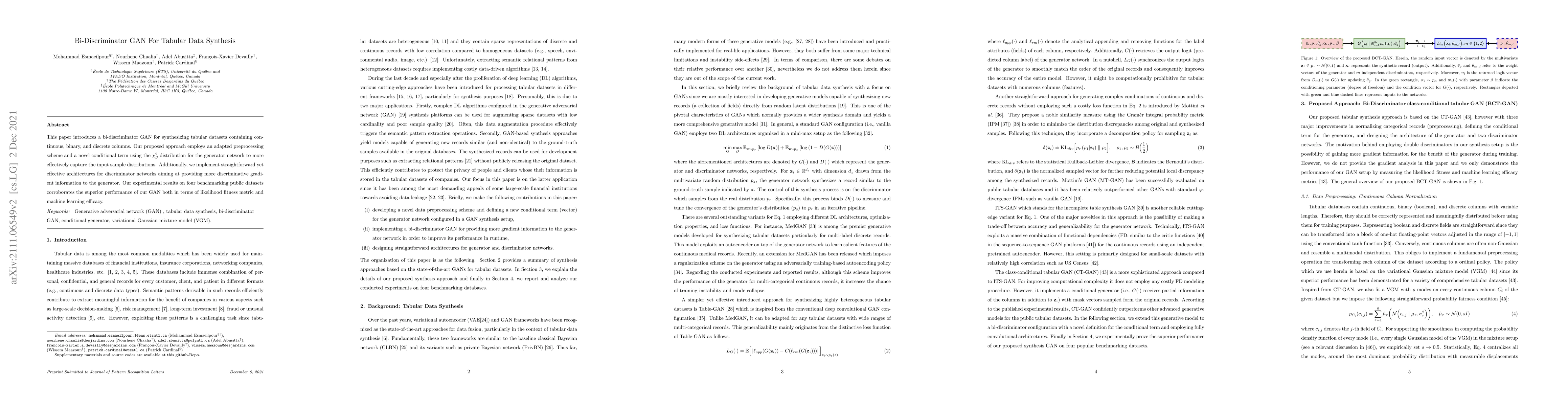 This paper introduces a bi-discriminator GAN for synthesizing tabular datasets with continuous, binary, and discrete columns, achieving superior performance in likelihood fitness metric and machine learning efficacy.