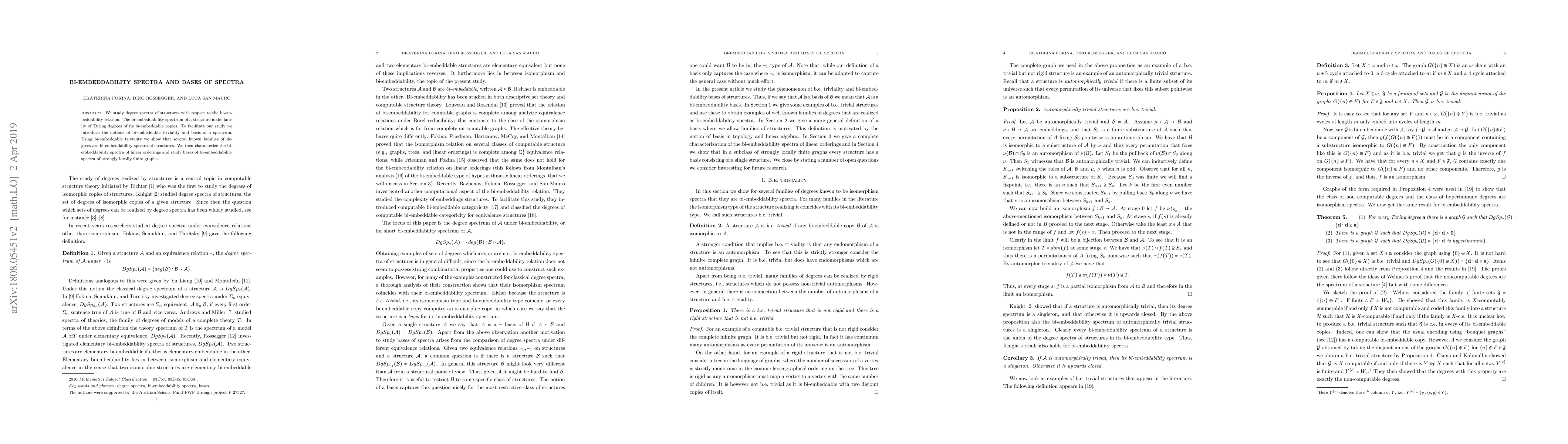 This paper explores the bi-embeddability spectra of structures, identifying the Turing degrees of their bi-embeddable copies, and introduces concepts of bi-embeddable triviality and spectrum bases. It demonstrates that several known degree families are spectra of certain structures and characterizes spectra for linear orderings and bases for strongly locally finite graphs.