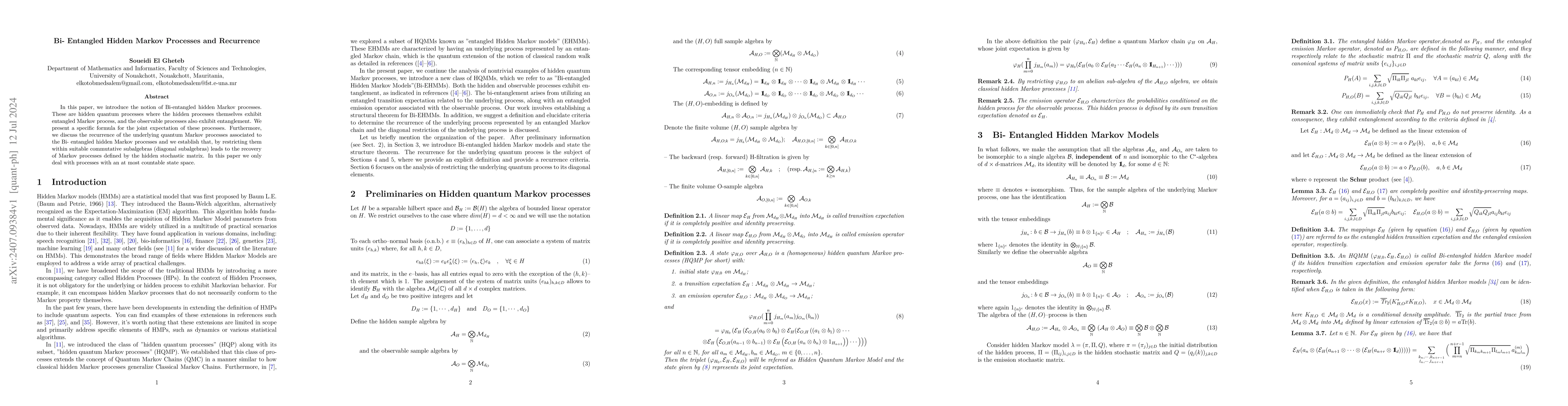This paper introduces bi-entangled hidden Markov processes, a type of quantum process where both hidden and observable processes show entanglement, and proposes a formula for their joint expectation. It also examines their recurrence properties and shows that restricting these processes to diagonal subalgebras recovers classical Markov processes defined by a hidden stochastic matrix.