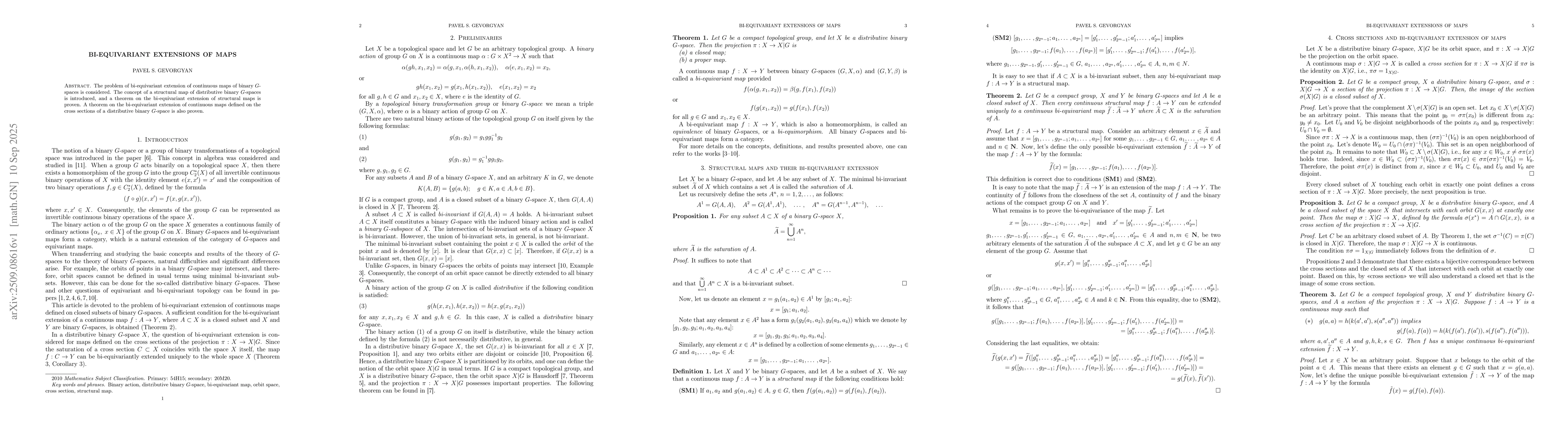 The problem of bi-equivariant extension of continuous maps of binary $G$-spaces is considered. The concept of a structural map of distributive binary $G$-spaces is introduced, and a theorem on the bi-equivariant extension of structural maps is proven. A theorem on the bi-equivariant extension of continuous maps defined on the cross sections of a distributive binary $G$-space is also proven.