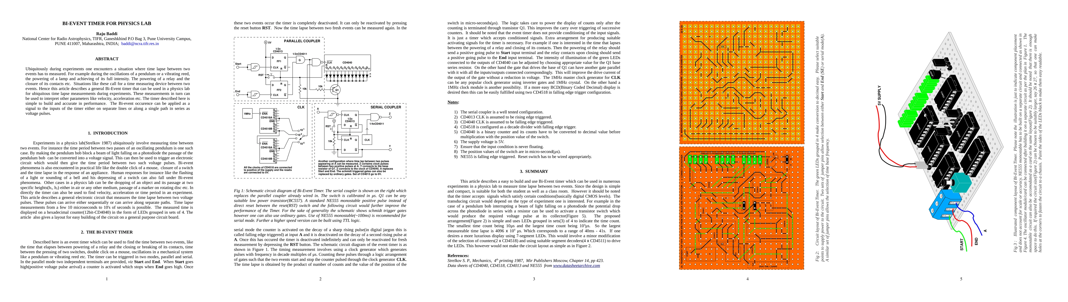 Ubiquitously during experiments one encounters a situation where time lapse between two events has to measured. For example during the oscillations of a pendulum or a vibrating reed, the powering of a lamp and achieving of its full intensity. The powering of a relay and the closure of its contacts etc. Situations like these call for a time measuring device between two events. Hence this article describes a general Bi-Event timer that can be used in a physics lab for ubiquitous time lapse measurements during experiments. These measurements in turn can be used to interpret other parameters like velocity, acceleration etc. The timer described here is simple to build and accurate in performance. The Bi-event occurence can be applied as a signal to the inputs of the timer either on separate lines or along a single path in series as voltage pulses.