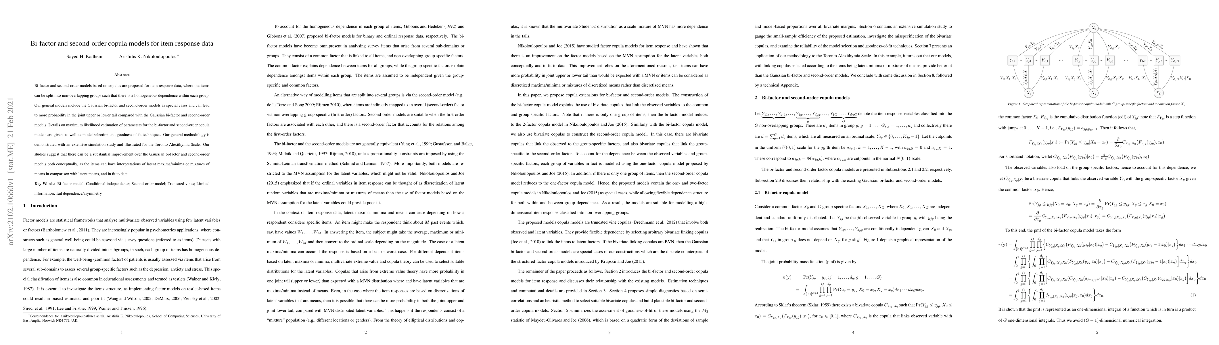 This paper proposes bi-factor and second-order copula models for item response data, allowing for non-overlapping groups with homogeneous dependence. The models offer substantial conceptual and empirical improvements over Gaussian bi-factor models, demonstrated through simulation studies and application to the Toronto Alexithymia Scale.