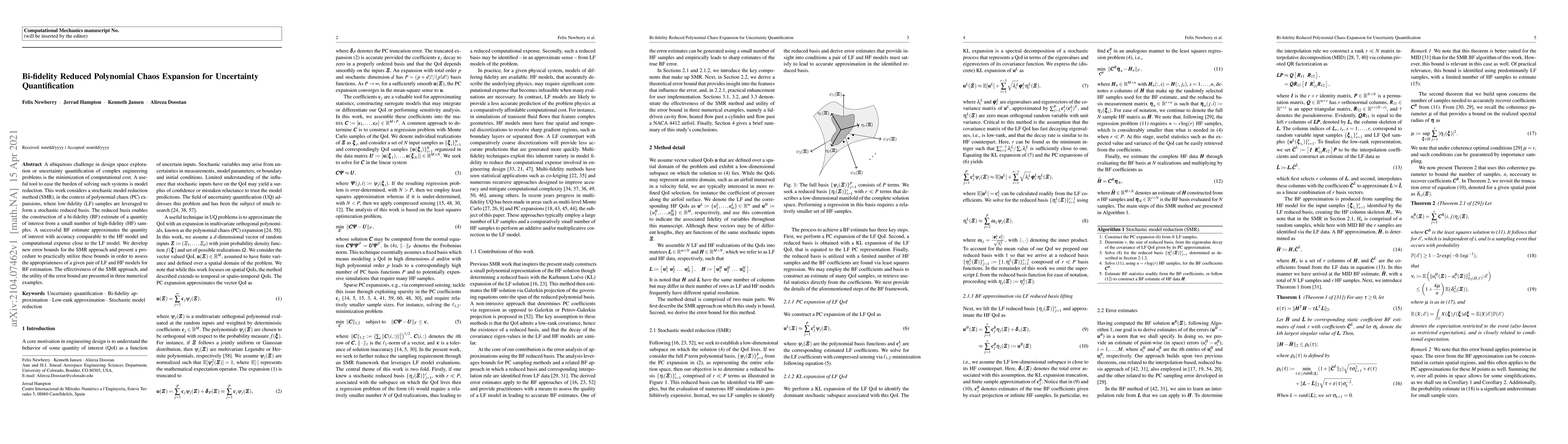 A ubiquitous challenge in design space exploration or uncertainty quantification of complex engineering problems is the minimization of computational cost. A useful tool to ease the burden of solving such systems is model reduction. This work considers a stochastic model reduction method (SMR), in the context of polynomial chaos (PC) expansions, where low-fidelity (LF) samples are leveraged to form a stochastic reduced basis. The reduced basis enables the construction of a bi-fidelity (BF) estimate of a quantity of interest from a small number of high-fidelity (HF) samples. A successful BF estimate approximates the quantity of interest with accuracy comparable to the HF model and computational expense close to the LF model. We develop new error bounds for the SMR approach and present a procedure to practically utilize these bounds in order to assess the appropriateness of a given pair of LF and HF models for BF estimation. The effectiveness of the SMR approach, and the utility of the error bound are presented in three numerical examples.