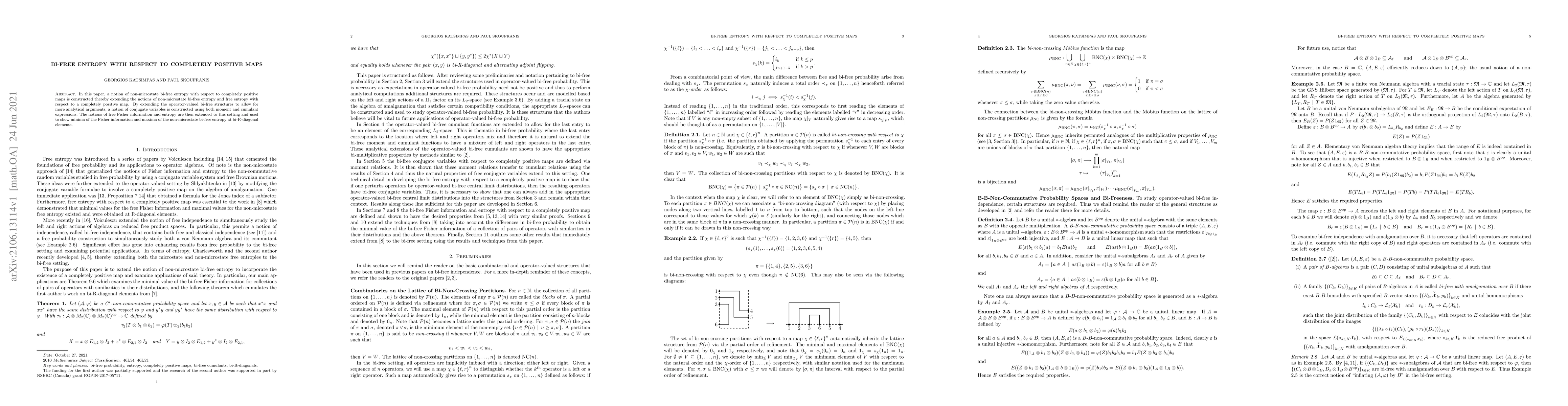 This paper introduces non-microstate bi-free entropy concerning completely positive maps, extending existing bi-free entropy and free entropy concepts. It also constructs conjugate variables and extends free Fisher information and entropy, demonstrating minima of Fisher information and maxima of bi-free entropy at bi-R-diagonal elements.
