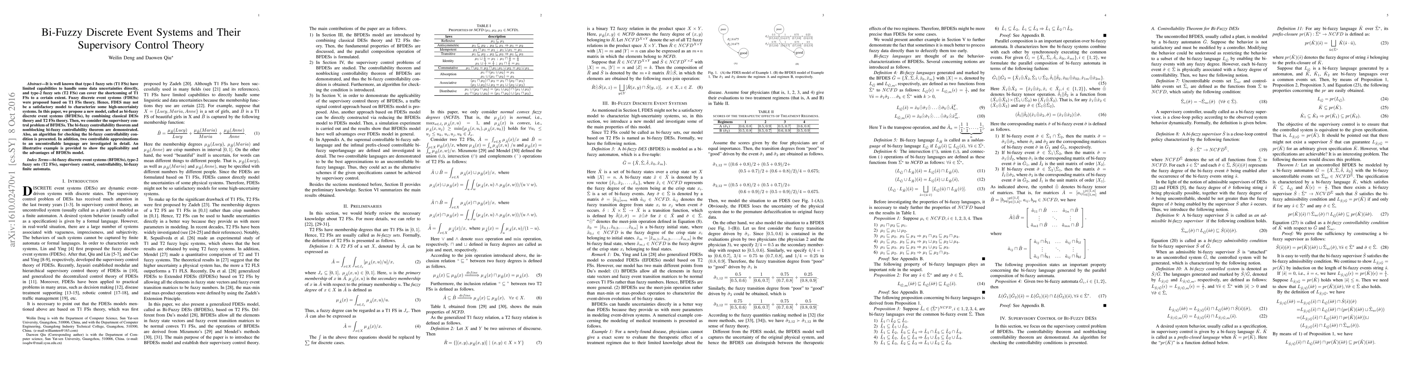 This paper introduces bi-fuzzy discrete event systems (BFDESs) that combine classical discrete event systems theory with type-2 fuzzy sets to better manage high-uncertainty systems. It presents supervisory control theory for BFDESs, including bi-fuzzy controllability theorems and an algorithm for checking controllability, along with examples demonstrating the model's advantages.