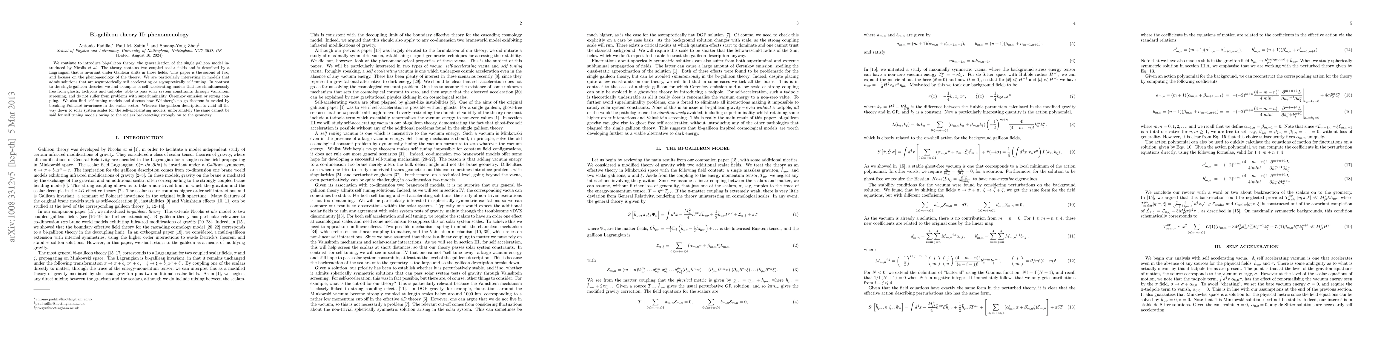 We continue to introduce bi-galileon theory, the generalisation of the single galileon model introduced by Nicolis et al. The theory contains two coupled scalar fields and is described by a Lagrangian that is invariant under Galilean shifts in those fields. This paper is the second of two, and focuses on the phenomenology of the theory. We are particularly interesting in models that admit solutions that are asymptotically self accelerating or asymptotically self tuning. In contrast to the single galileon theories, we find examples of self accelerating models that are simultaneously free from ghosts, tachyons and tadpoles, able to pass solar system constraints through Vainshtein screening, and do not suffer from problems with superluminality, Cerenkov emission or strong coupling. We also find self tuning models and discuss how Weinberg's no go theorem is evaded by breaking Poincar\'e invariance in the scalar sector. Whereas the galileon description is valid all the way down to solar system scales for the self-accelerating models, unfortunately the same cannot be said for self tuning models owing to the scalars backreacting strongly on to the geometry.