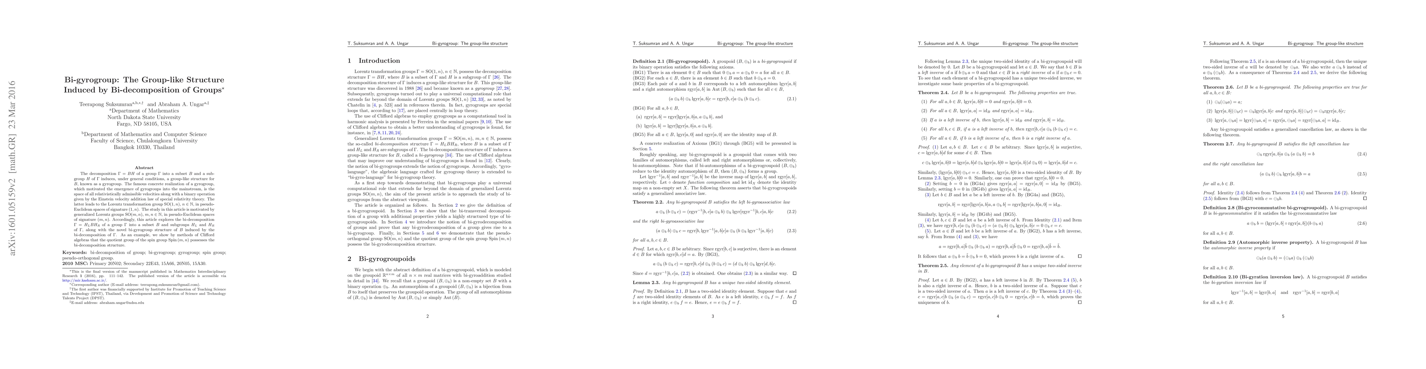 The decomposition $\Gamma=BH$ of a group $\Gamma$ into a subset $B$ and a subgroup $H$ of $\Gamma$ induces, under general conditions, a group-like structure for $B$, known as a gyrogroup. The famous concrete realization of a gyrogroup, which motivated the emergence of gyrogroups into the mainstream, is the space of all relativistically admissible velocities along with a binary operation given by the Einstein velocity addition law of special relativity theory. The latter leads to the Lorentz transformation group $\mathrm{SO}(1,n)$, $n\in\mathbb{N}$, in pseudo-Euclidean spaces of signature $(1, n)$. The study in this article is motivated by generalized Lorentz groups $\mathrm{SO}(m, n)$, $m, n\in\mathbb{N}$, in pseudo-Euclidean spaces of signature $(m, n)$. Accordingly, this article explores the bi-decomposition $\Gamma = H_LBH_R$ of a group $\Gamma$ into a subset $B$ and subgroups $H_L$ and $H_R$ of $\Gamma$, along with the novel bi-gyrogroup structure of $B$ induced by the bi-decomposition of $\Gamma$. As an example, we show by methods of Clifford algebras that the quotient group of the spin group $\mathrm{spin}(m, n)$ possesses the bi-decomposition structure.
