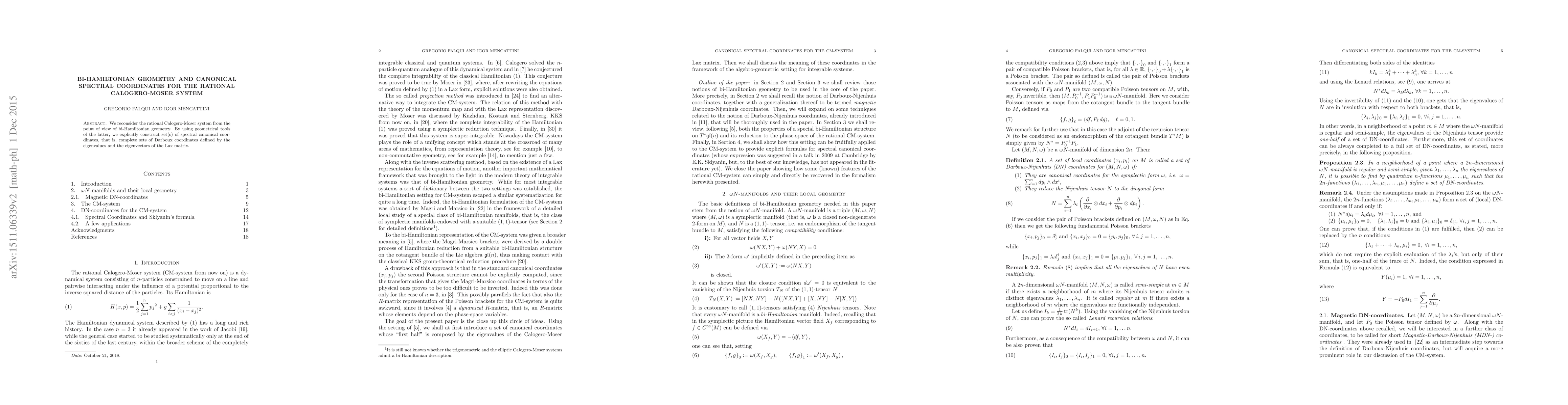 The paper explores the rational Calogero-Moser system through the lens of bi-Hamiltonian geometry and constructs canonical spectral coordinates using the Lax matrix's eigenvalues and eigenvectors. This provides a comprehensive Darboux coordinate system.