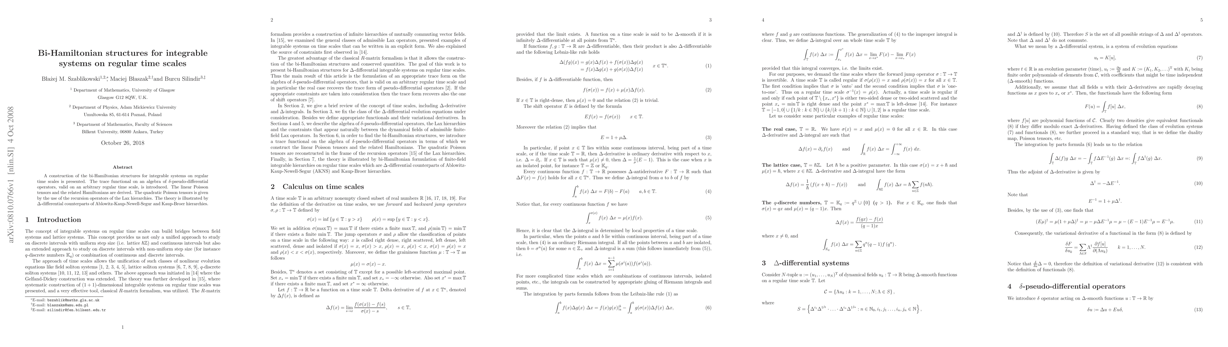 This paper constructs bi-Hamiltonian structures for integrable systems on regular time scales, introducing a trace functional on $\delta$-pseudo-differential operators. It derives linear and quadratic Poisson tensors, illustrating the theory with $\Delta$-differential versions of Ablowitz-Kaup-Newell-Segur and Kaup-Broer hierarchies.