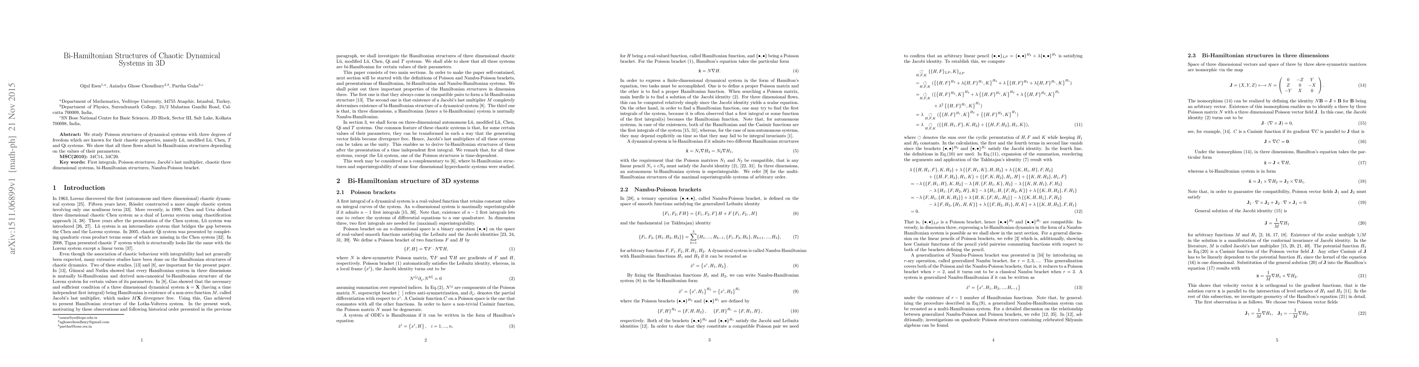 Summary: This paper investigates the Poisson structures of five chaotic dynamical systems with three degrees of freedom, revealing that all exhibit bi-Hamiltonian structures contingent on their parameter values. The study highlights the potential for understanding chaos through bi-Hamiltonian frameworks.