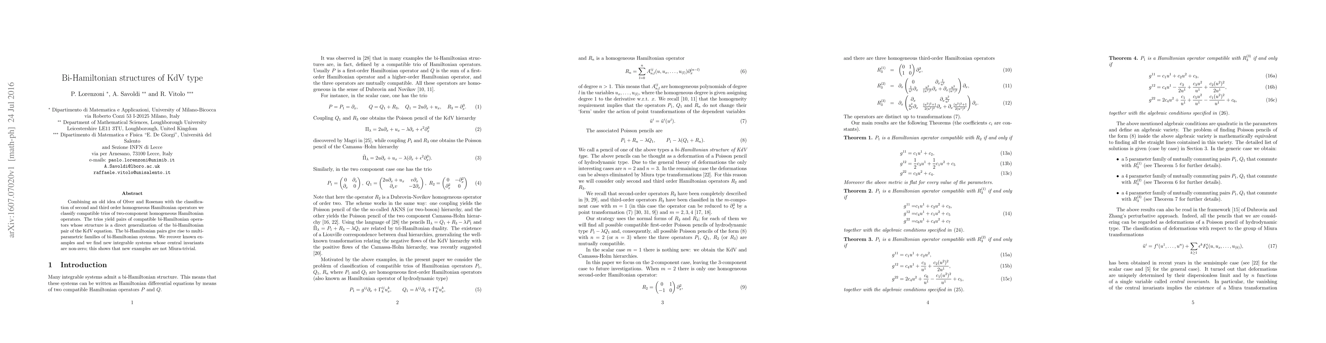 This paper classifies compatible trios of two-component homogeneous Hamiltonian operators, yielding multi-parametric families of bi-Hamiltonian systems that generalize the KdV equation. It identifies new integrable systems that are not trivial, demonstrating the presence of non-zero central invariants.