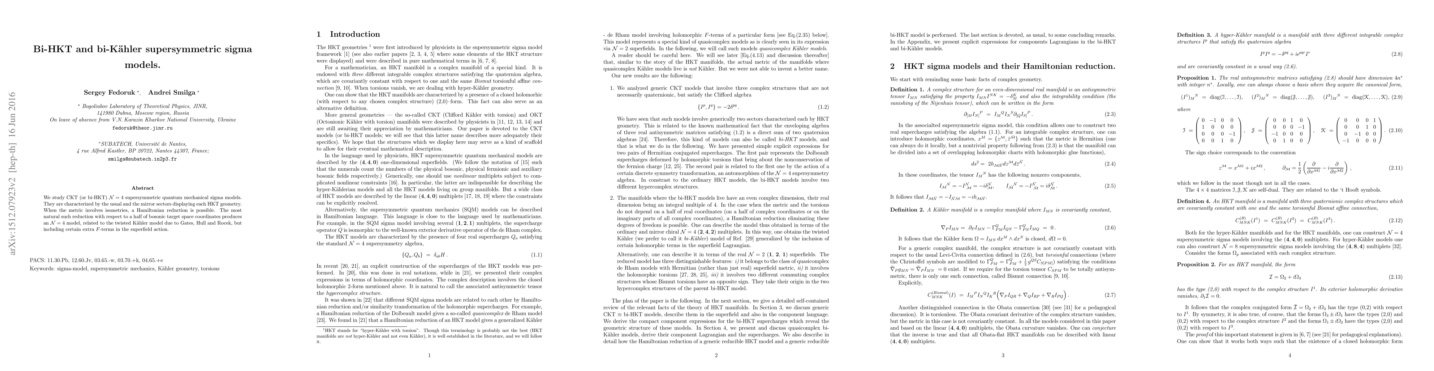 We study CKT (or bi-HKT) N = 4 supersymmetric quantum mechanical sigma models. They are characterized by the usual and the mirror sectors displaying each HKT geometry. When the metric involves isometries, a Hamiltonian reduction is possible. The most natural such reduction with respect to a half of bosonic target space coordinates produces an N = 4 model, related to the twisted Kaehler model due to Gates, Hull and Rocek, but including certain extra F-terms in the superfield action.