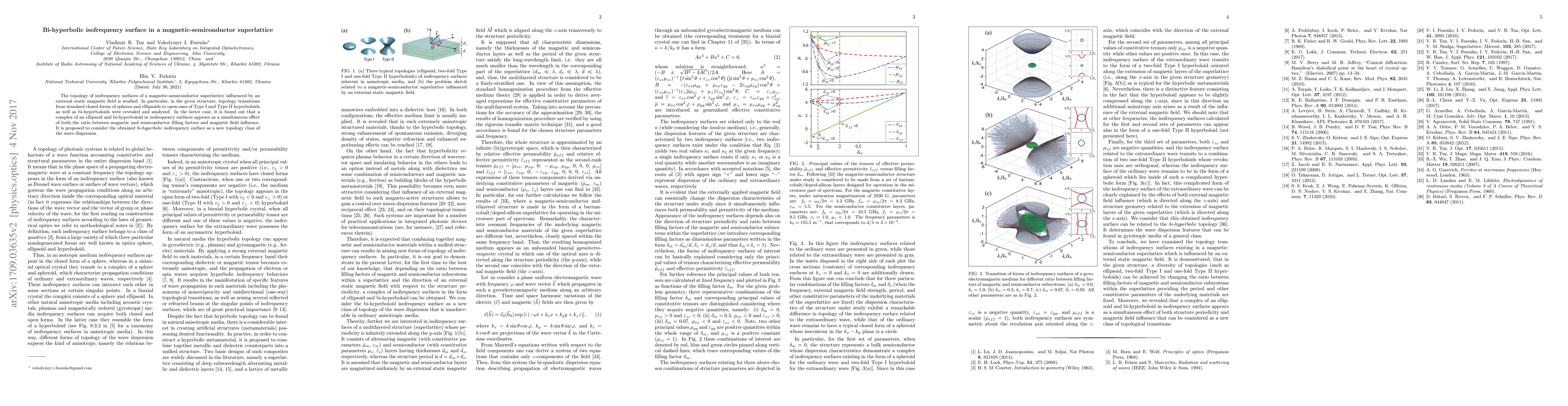 The topology of isofrequency surfaces of a magnetic-semiconductor superlattice influenced by an external static magnetic field is studied. In particular, in the given structure, topology transitions from standard closed forms of spheres and ellipsoids to open ones of Type I and Type II hyperboloids as well as bi-hyperboloids were revealed and analyzed. In the latter case, it is found out that a complex of an ellipsoid and bi-hyperboloid in isofrequency surfaces appears as a simultaneous effect of both the ratio between magnetic and semiconductor filling factors and magnetic field influence. It is proposed to consider the obtained bi-hyperbolic isofrequency surface as a new topology class of the wave dispersion.
