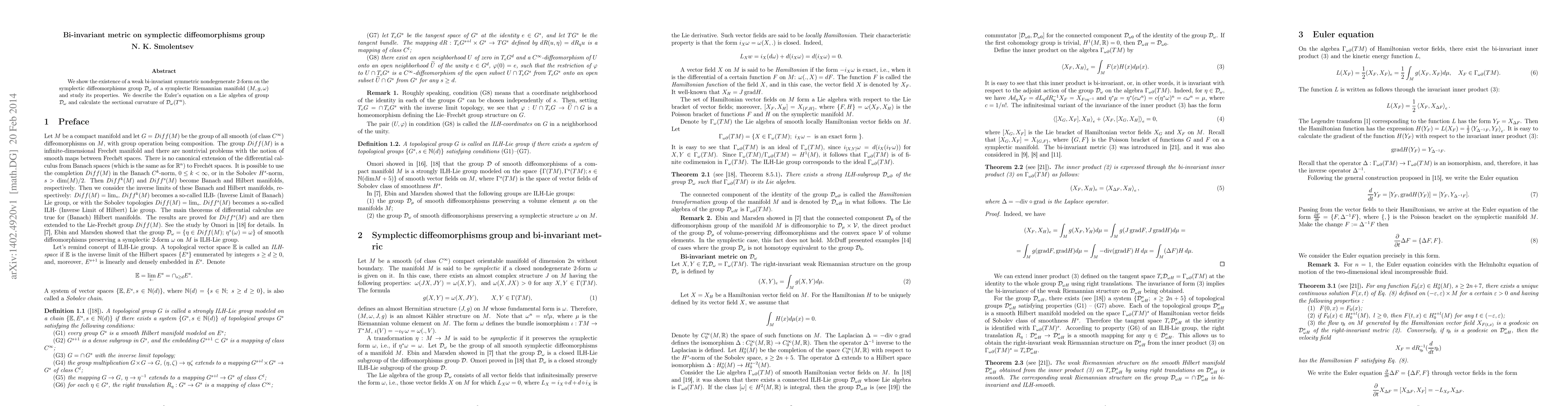 This paper demonstrates the existence of a bi-invariant symmetric nondegenerate 2-form on the symplectic diffeomorphisms group $\mathcal{D}_\omega$ of a symplectic Riemannian manifold, and explores its properties, including the Euler's equation on its Lie algebra and sectional curvature calculations.