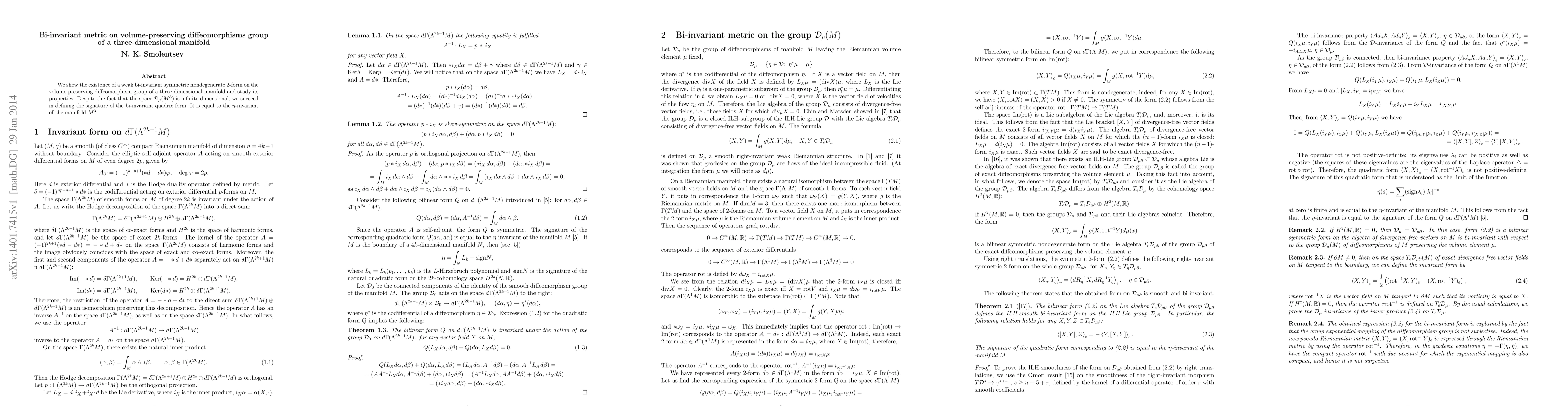 Researchers showed that a bi-invariant metric exists on the volume-preserving diffeomorphism group of 3D manifolds, with its signature equal to the manifold's $ heta$-invariant.