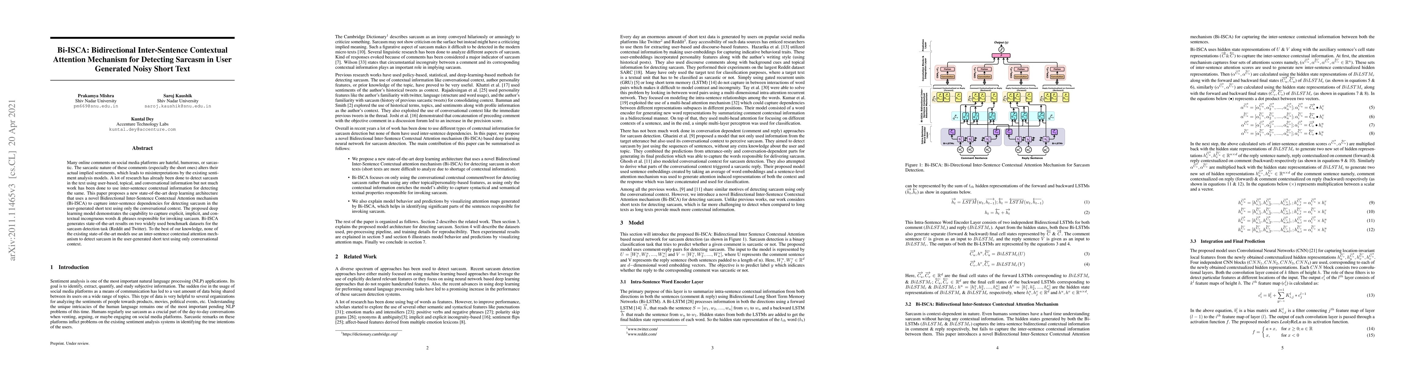This paper introduces a novel Bidirectional Inter-Sentence Contextual Attention mechanism (Bi-ISCA) to detect sarcasm in short user-generated text by capturing inter-sentence dependencies. The proposed deep learning model achieves state-of-the-art results on Reddit and Twitter datasets, outperforming existing models that do not utilize inter-sentence contextual information.