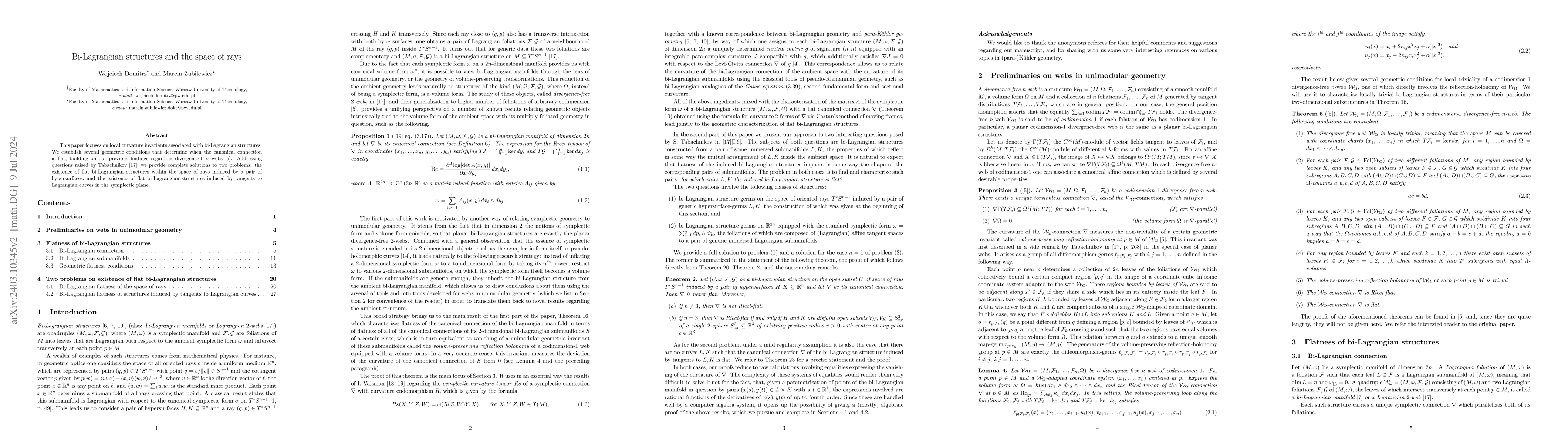 This paper focuses on local curvature invariants associated with bi-Lagrangian structures. We establish several geometric conditions that determine when the canonical connection is flat, building on our previous findings regarding divergence-free webs. Addressing questions raised by Tabachnikov, we provide complete solutions to two problems: the existence of flat bi-Lagrangian structures within the space of rays induced by a pair of hypersurfaces, and the existence of flat bi-Lagrangian structures induced by tangents to Lagrangian curves in the symplectic plane.