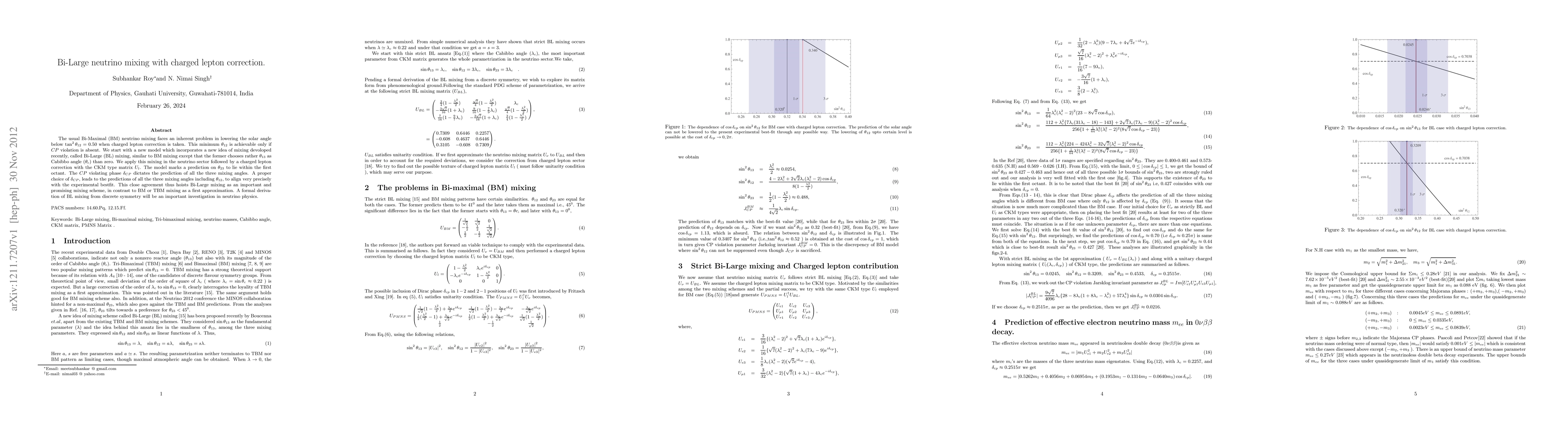 This paper proposes a Bi-Large (BL) neutrino mixing model that addresses the limitations of Bi-Maximal (BM) mixing by incorporating charged lepton corrections, predicting precise alignment with experimental best-fit values for all three mixing angles, and suggesting $\theta_{23}$ within the first octant. The model's success hinges on the CP violating phase $\delta_{CP}$.