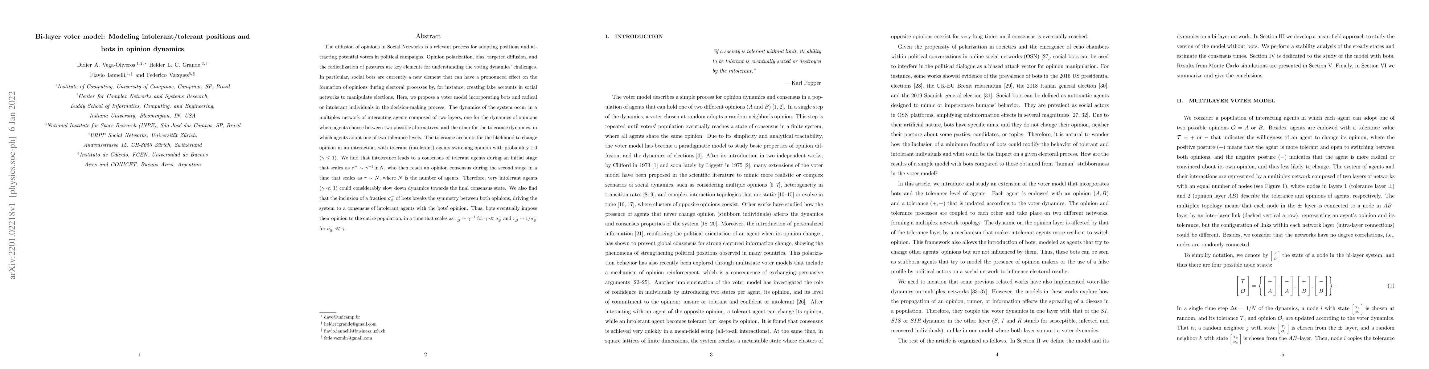 This paper proposes a bi-layer voter model to study opinion dynamics in social networks, incorporating intolerant/tolerant individuals and social bots. It finds that intolerant agents can slow consensus formation, while bots can impose their opinion, leading to a consensus of intolerant views.