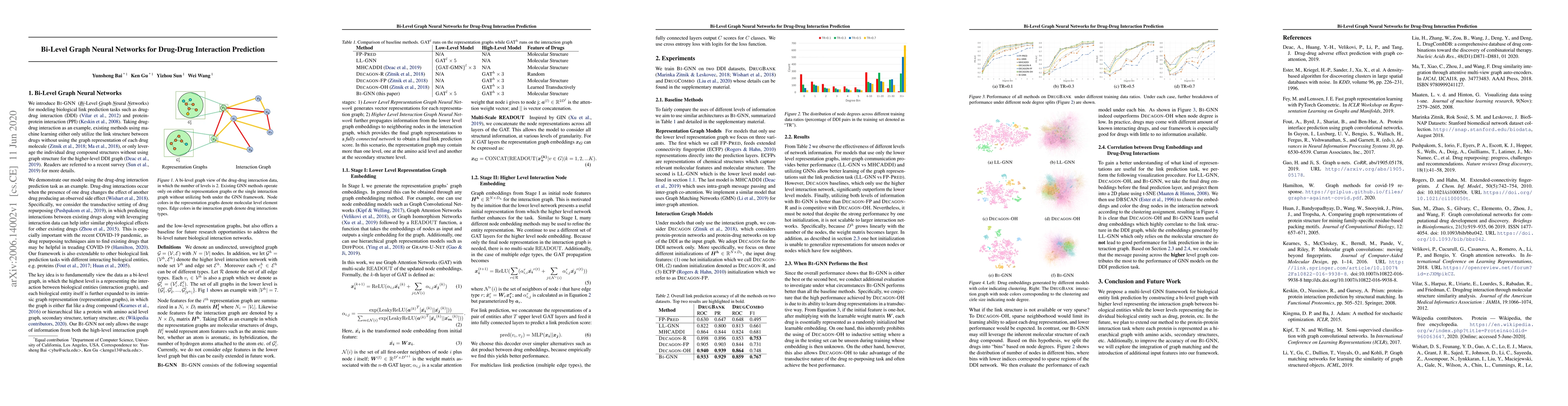 We introduce Bi-GNN for modeling biological link prediction tasks such as drug-drug interaction (DDI) and protein-protein interaction (PPI). Taking drug-drug interaction as an example, existing methods using machine learning either only utilize the link structure between drugs without using the graph representation of each drug molecule, or only leverage the individual drug compound structures without using graph structure for the higher-level DDI graph. The key idea of our method is to fundamentally view the data as a bi-level graph, where the highest level graph represents the interaction between biological entities (interaction graph), and each biological entity itself is further expanded to its intrinsic graph representation (representation graphs), where the graph is either flat like a drug compound or hierarchical like a protein with amino acid level graph, secondary structure, tertiary structure, etc. Our model not only allows the usage of information from both the high-level interaction graph and the low-level representation graphs, but also offers a baseline for future research opportunities to address the bi-level nature of the data.