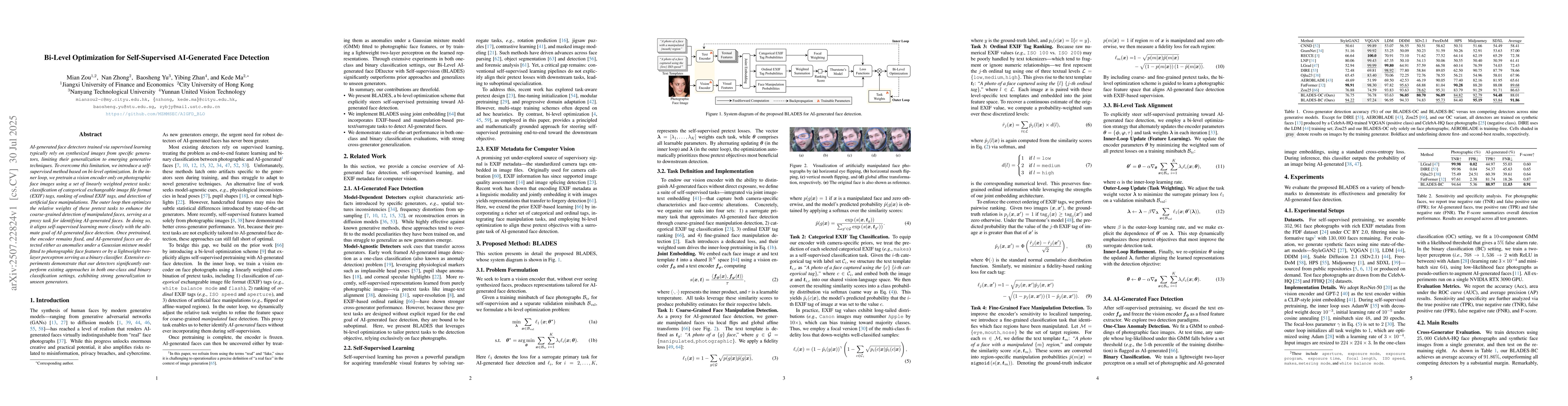 The novelty lies in the self-supervised approach using bi-level optimization that dynamically weights pretext tasks based on their relevance to the primary task of AI-generated face detection, improving generalization across diverse generative models and datasets.
