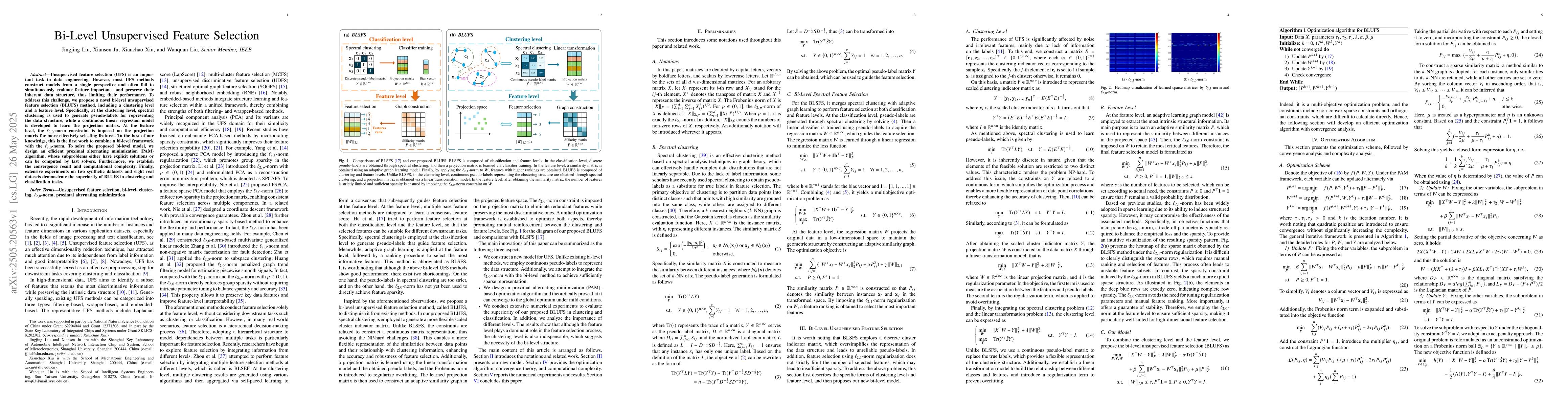 A new method called Bi-Level Unsupervised Feature Selection (BLUFS) is proposed to improve feature selection in data engineering, combining clustering and linear regression for better performance. The BLUFS method outperforms existing methods on synthetic and real datasets for clustering and classification tasks.
