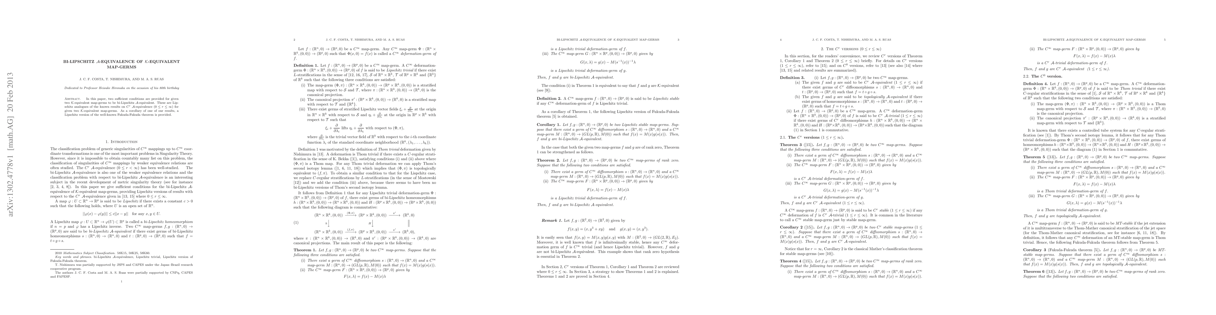 This paper establishes sufficient conditions for bi-Lipschitz A-equivalence of K-equivalent map germs, providing Lipschitz analogues of results on C^r-A-equivalence. It also derives a Lipschitz version of the Fukuda-Fukuda theorem as a corollary.