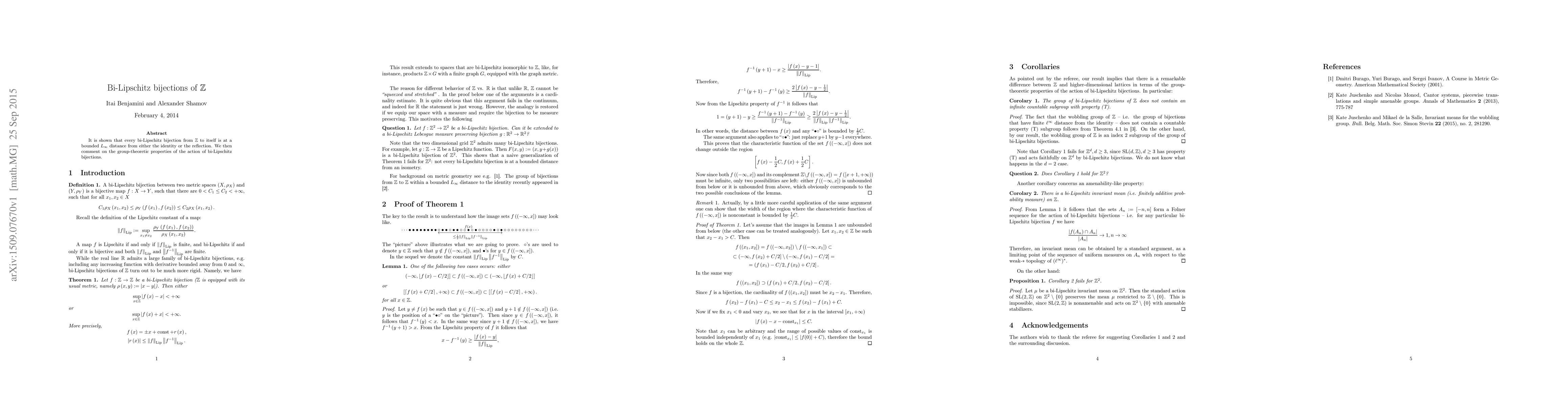 This paper demonstrates that any bi-Lipschitz bijection from the integers $\mathbb{Z}$ to itself is within a bounded $L_{\infty}$ distance from either the identity function or its reflection, and explores the associated group-theoretic properties of these mappings.