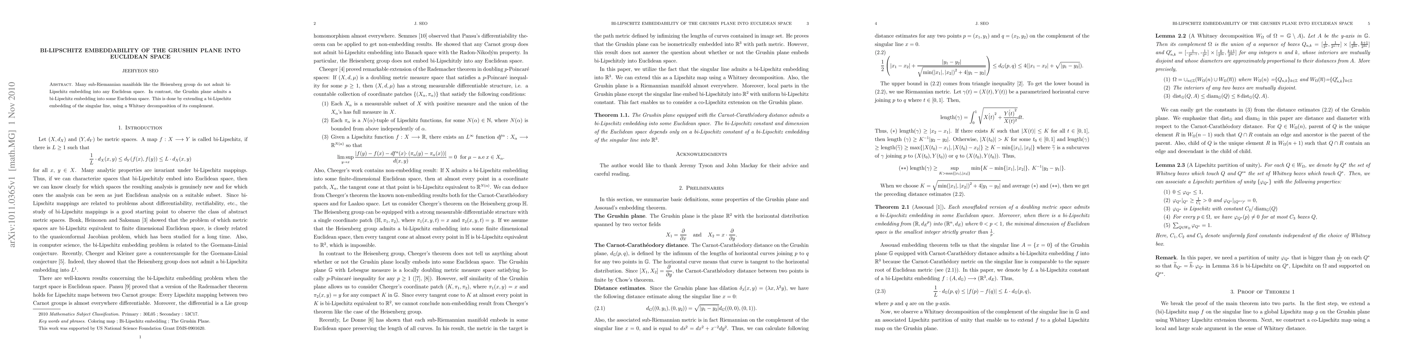 The Grushin plane can be bi-Lipschitz embedded into Euclidean space, unlike many sub-Riemannian manifolds like the Heisenberg group. This is achieved by extending a bi-Lipschitz embedding of the singular line through a Whitney decomposition of its complement.