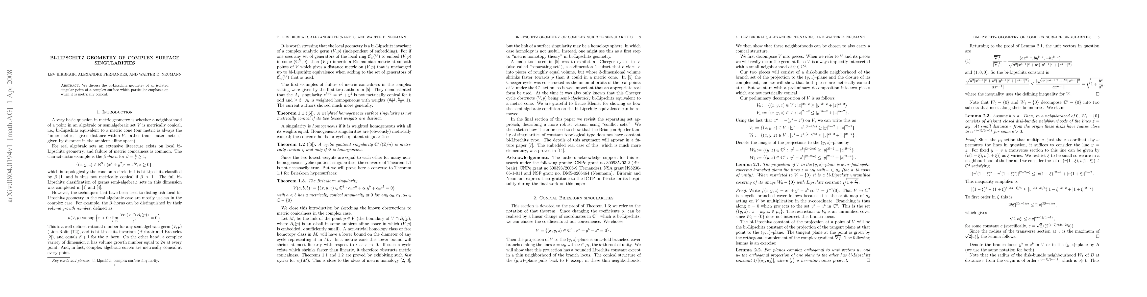 Summary: This paper explores the bi-Lipschitz geometry of isolated singular points on complex surfaces, focusing on conditions under which these singularities exhibit metrically conical behavior. The study highlights the geometric and topological properties that define such metric conicity.