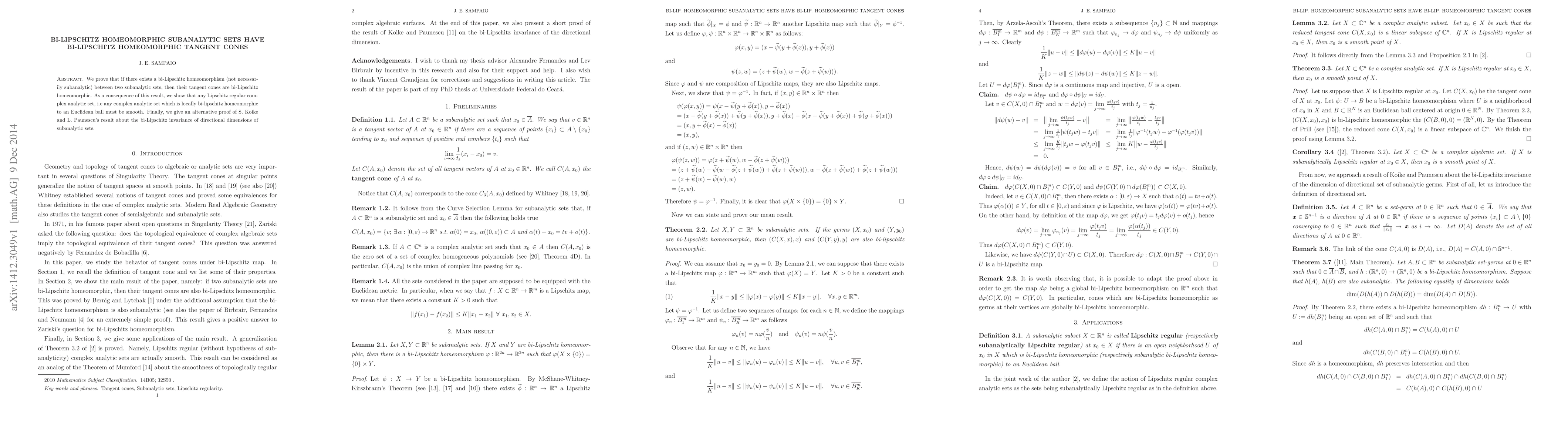 This paper proves that bi-Lipschitz homeomorphisms between subanalytic sets imply bi-Lipschitz homeomorphisms of their tangent cones. It also concludes that any Lipschitz regular complex analytic set must be smooth. Additionally, it provides an alternative proof of the bi-Lipschitz invariance of directional dimensions for subanalytic sets.