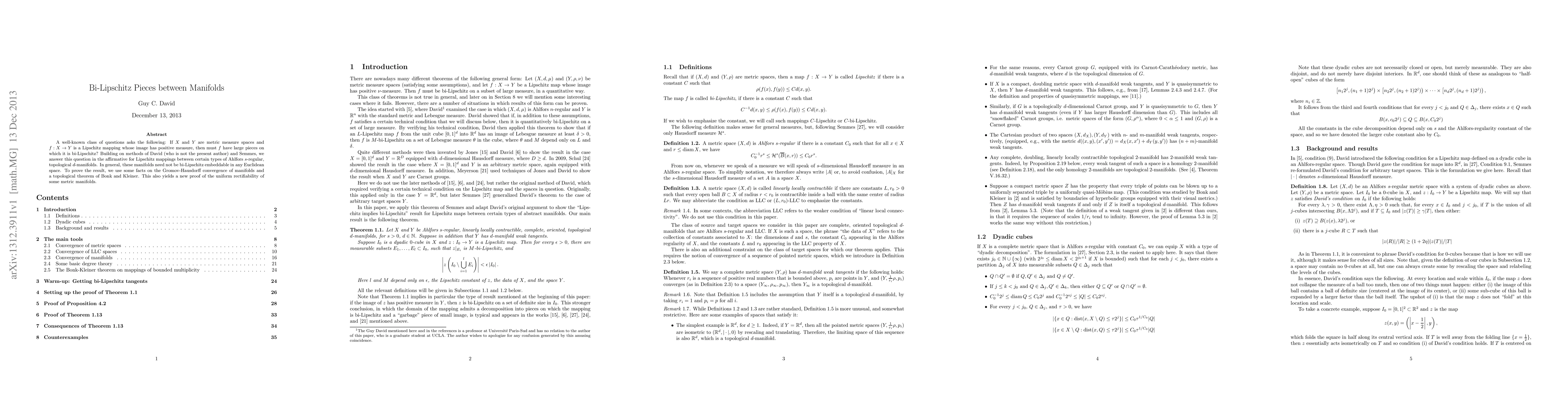This paper proves that a Lipsitz mapping between certain manifolds will have large pieces where it is bi-Lipsitz, and also yields a new proof for the uniform rectifiability of some metric manifolds.