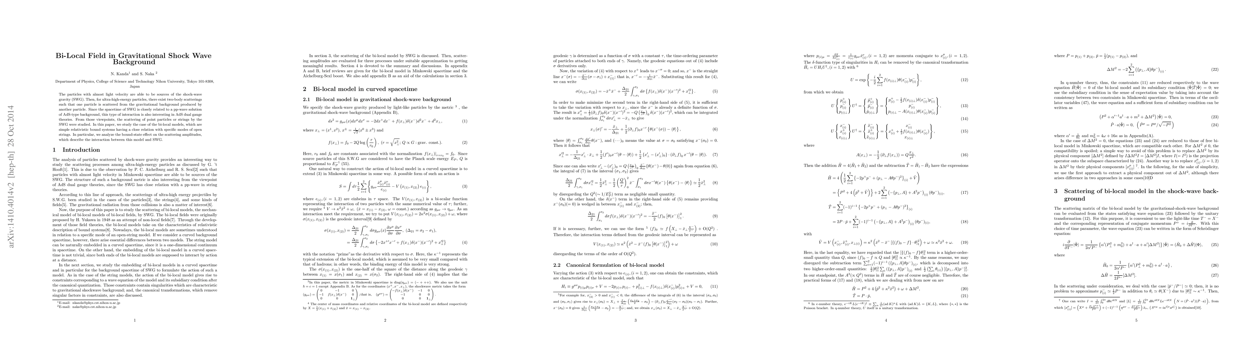 The particles with almost light velocity are able to be sources of the shock-wave gravity (SWG). Then, for ultra-high-energy particles, there exist two-body scatterings such that one particle is scattered from the gravitational background produced by another particle. Since the spacetime of SWG is closely related to a pp-wave solution of AdS-type background, this type of interaction is also interesting in AdS dual gauge theories. From those viewpoints, the scattering of point particles or strings by the SWG were studied. In this paper, we study the case of the bi-local models, which are simple relativistic bound systems having a close relation with specific modes of open strings. In particular, we analyze the bound-state effect on the scattering amplitudes, which describe the interaction between this model and SWG.