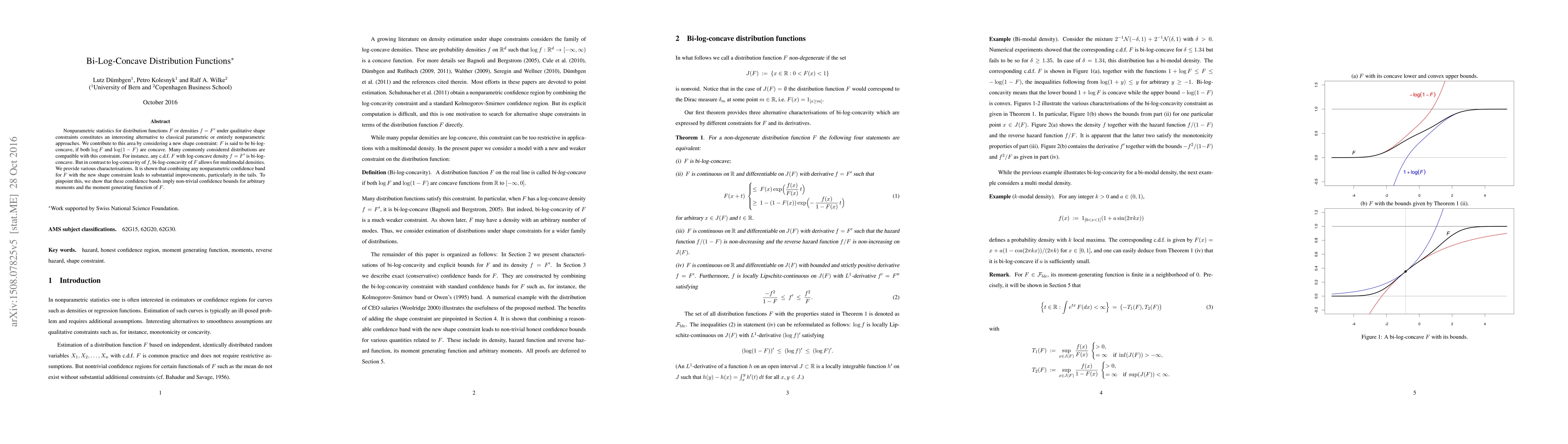 This paper introduces the concept of bi-log-concave distribution functions, where both log(F) and log(1 - F) are concave, allowing for multimodal densities unlike traditional log-concave constraints. The authors demonstrate that this shape constraint significantly enhances nonparametric confidence bands, particularly in the tails, and provides non-trivial confidence bounds for moments and the moment generating function.