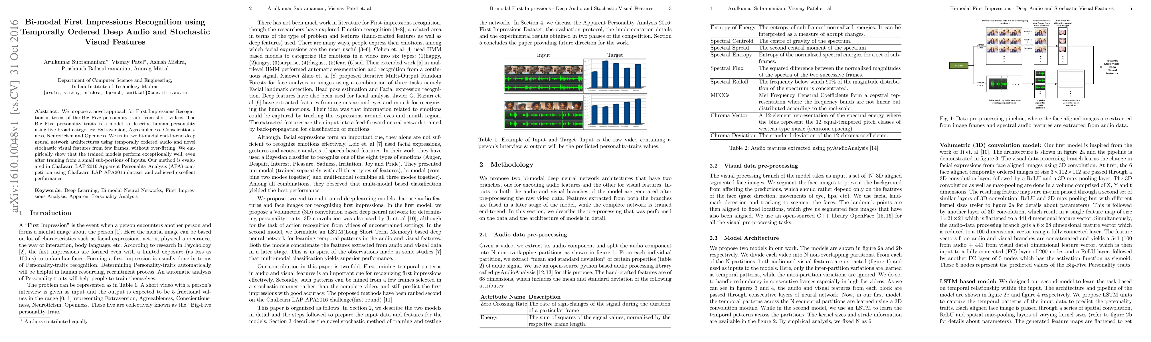 This paper introduces a bi-modal deep neural network for recognizing first impressions based on the Big Five personality traits from short video clips, using temporally ordered audio and stochastic visual features. The proposed method achieves high performance even with limited training data, as demonstrated in the ChaLearn LAP 2016 competition.
