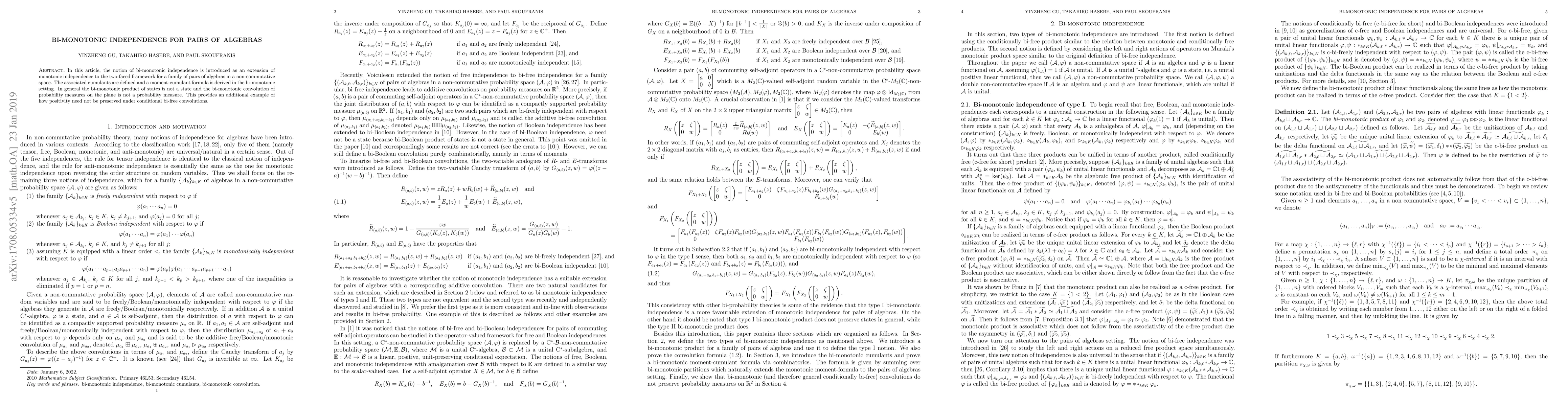 This paper introduces bi-monotonic independence for pairs of algebras in non-commutative spaces, extending monotonic independence. It defines associated cumulants and derives a moment-cumulant formula, highlighting that bi-monotonic operations often do not preserve positivity, unlike traditional convolutions.