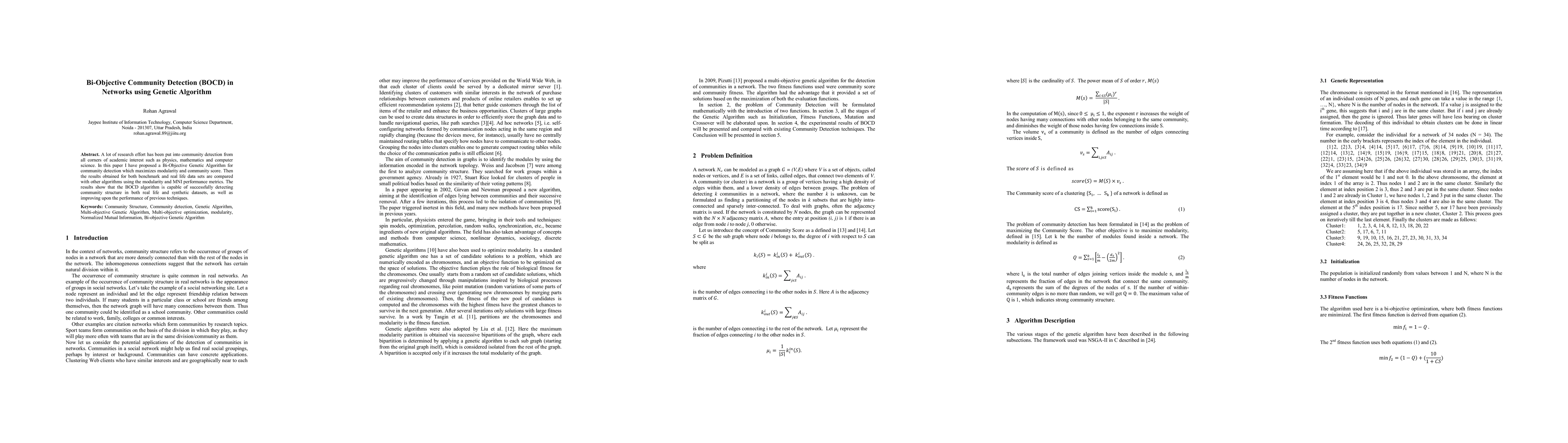 Summary: This paper proposes a Bi-Objective Genetic Algorithm for community detection that maximizes modularity and community score, showing improved performance on both synthetic and real datasets compared to other methods. The effectiveness is measured using modularity and MNI metrics.