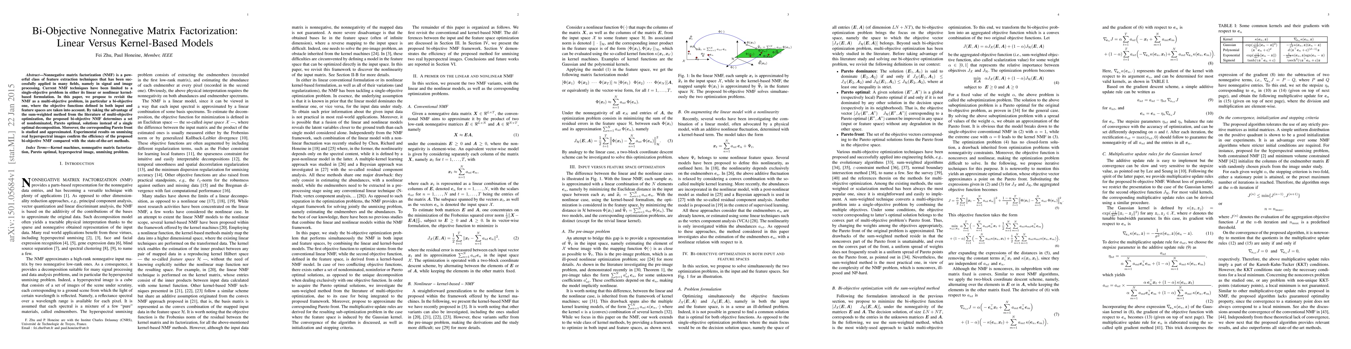 Nonnegative matrix factorization (NMF) is a powerful class of feature extraction techniques that has been successfully applied in many fields, namely in signal and image processing. Current NMF techniques have been limited to a single-objective problem in either its linear or nonlinear kernel-based formulation. In this paper, we propose to revisit the NMF as a multi-objective problem, in particular a bi-objective one, where the objective functions defined in both input and feature spaces are taken into account. By taking the advantage of the sum-weighted method from the literature of multi-objective optimization, the proposed bi-objective NMF determines a set of nondominated, Pareto optimal, solutions instead of a single optimal decomposition. Moreover, the corresponding Pareto front is studied and approximated. Experimental results on unmixing real hyperspectral images confirm the efficiency of the proposed bi-objective NMF compared with the state-of-the-art methods.