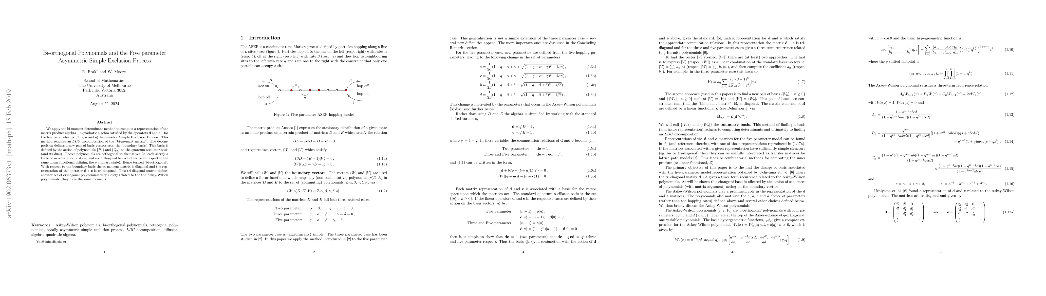 We apply the bi-moment determinant method to compute a representation of the matrix product algebra -- a quadratic algebra satisfied by the operators $\mathbf{d}$ and $\mathbf{e}$ -- for the five parameter ($\alpha$, $\beta$, $\gamma$, $\delta$ and $q$) Asymmetric Simple Exclusion Process. This method requires an $LDU$ decomposition of the ``bi-moment matrix''. The decomposition defines a new pair of basis vectors sets, the `boundary basis'. This basis is defined by the action of polynomials $\{P_n\}$ and $\{Q_n\}$ on the quantum oscillator basis (and its dual). Theses polynomials are orthogonal to themselves (ie.\ each satisfy a three term recurrence relation) and are orthogonal to each other (with respect to the same linear functional defining the stationary state). Hence termed `bi-orthogonal'. With respect to the boundary basis the bi-moment matrix is diagonal and the representation of the operator $\mathbf{d}+\mathbf{e}$ is tri-diagonal. This tri-diagonal matrix defines another set of orthogonal polynomials very closely related to the the Askey-Wilson polynomials (they have the same moments).