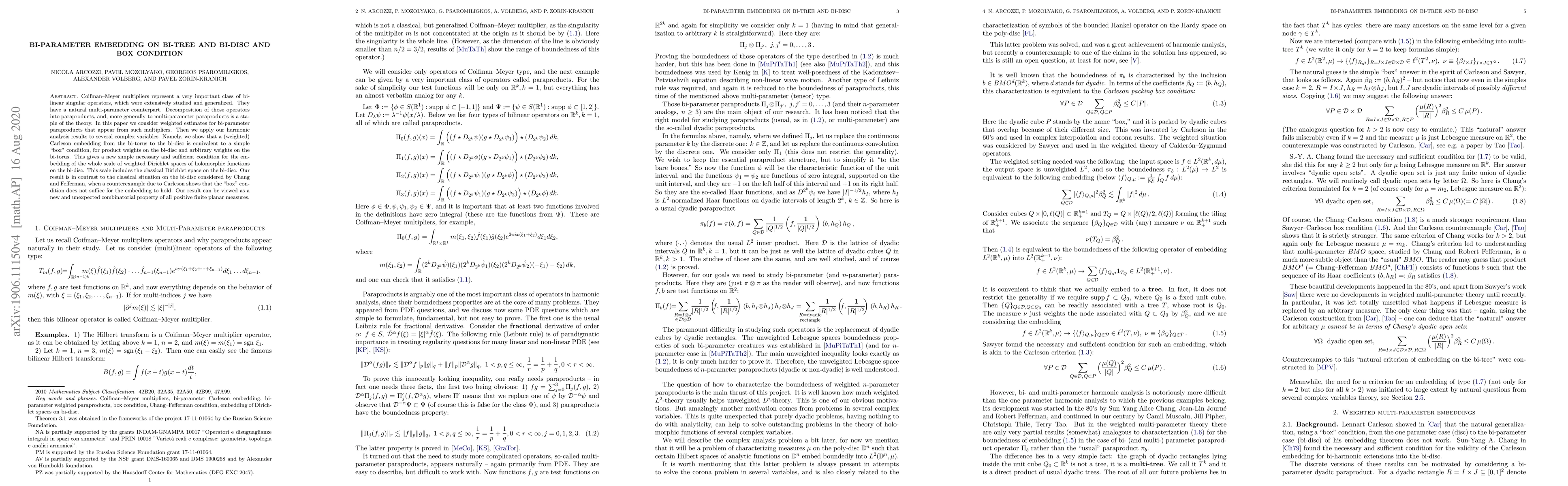 Coifman--Meyer multipliers represent a very important class of bi-linear singular operators, which were extensively studied and generalized. They have a natural multi-parameter counterpart. Decomposition of those operators into paraproducts, and, more generally to multi-parameter paraproducts is a staple of the theory. In this paper we consider weighted estimates for bi-parameter paraproducts that appear from such multipliers. Then we apply our harmonic analysis results to several complex variables. Namely, we show that a (weighted) Carleson embedding for a scale of Dirichlet spaces from the bi-torus to the bi-disc is equivalent to a simple ``box'' condition, for product weights on the bi-disc and arbitrary weights on the bi-torus. This gives a new simple necessary and sufficient condition for the embedding of the whole scale of weighted Dirichlet spaces of holomorphic functions on the bi-disc. This scale of Dirichlet spaces includes the classical Dirichlet space on the bi-disc. Our result is in contrast to the classical situation on the bi-disc considered by Chang and Fefferman, when a counterexample due to Carleson shows that the ``box'' condition does not suffice for the embedding to hold. But this was the embedding of bi-harmonic functions in bi-harmonic Hardy class. Our result can be viewed as a new and unexpected combinatorial property of all positive finite planar measures.