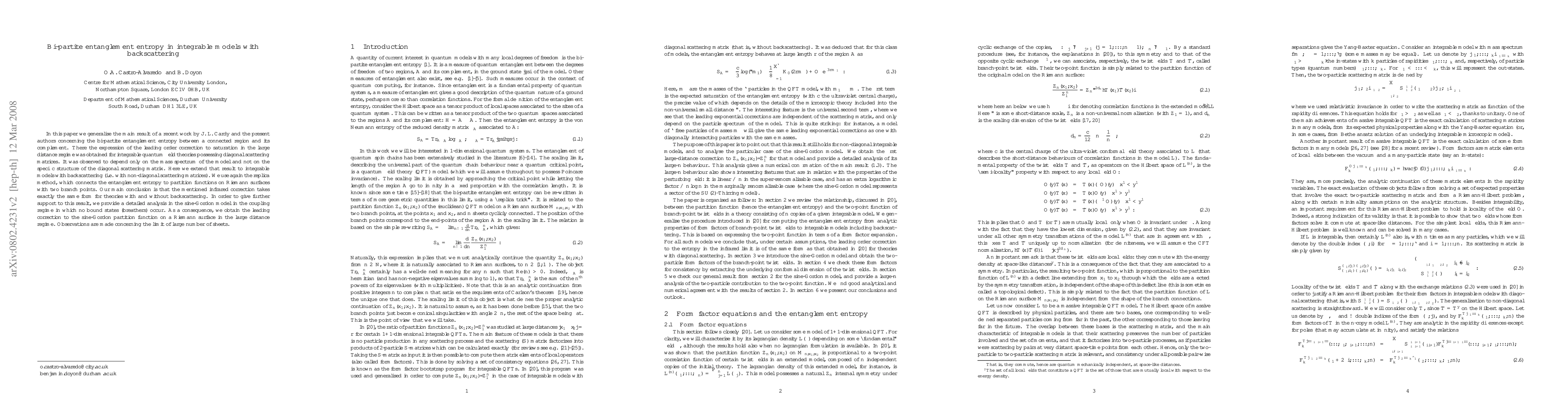 In this paper we generalise the main result of a recent work by J. L. Cardy and the present authors concerning the bi-partite entanglement entropy between a connected region and its complement. There the expression of the leading order correction to saturation in the large distance regime was obtained for integrable quantum field theories possessing diagonal scattering matrices. It was observed to depend only on the mass spectrum of the model and not on the specific structure of the diagonal scattering matrix. Here we extend that result to integrable models with backscattering (i.e. with non-diagonal scattering matrices). We use again the replica method, which connects the entanglement entropy to partition functions on Riemann surfaces with two branch points. Our main conclusion is that the mentioned infrared correction takes exactly the same form for theories with and without backscattering. In order to give further support to this result, we provide a detailed analysis in the sine-Gordon model in the coupling regime in which no bound states (breathers) occur. As a consequence, we obtain the leading correction to the sine-Gordon partition function on a Riemann surface in the large distance regime. Observations are made concerning the limit of large number of sheets.