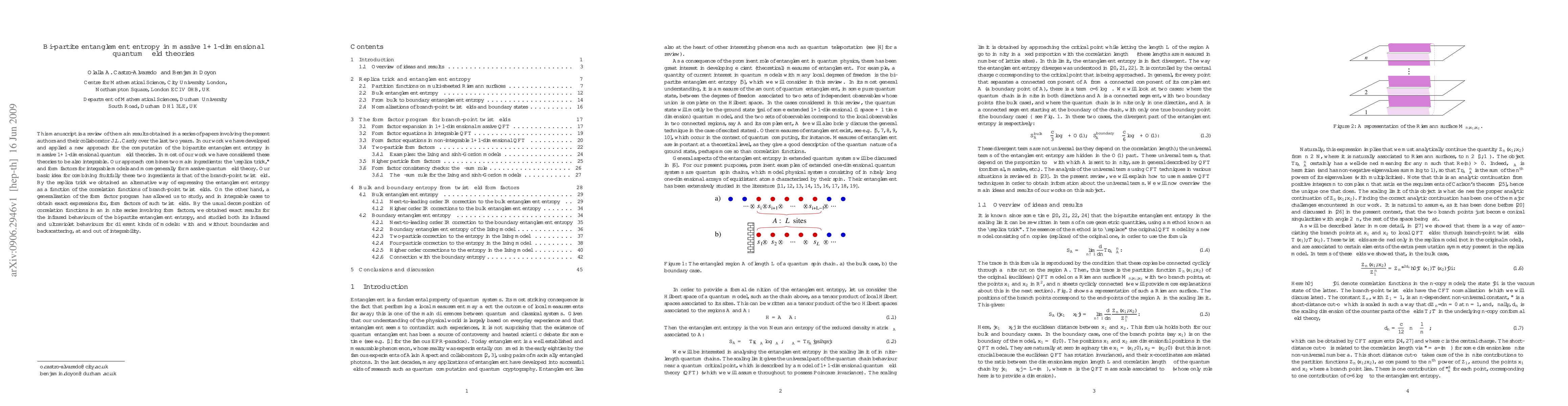 This paper reviews the authors' new method for calculating bi-partite entanglement entropy in massive 1+1-dimensional quantum field theories, combining the "replica trick" and integrable model form factors through the concept of branch-point twist fields to derive exact expressions for the infrared behavior of entanglement entropy across various theoretical models.