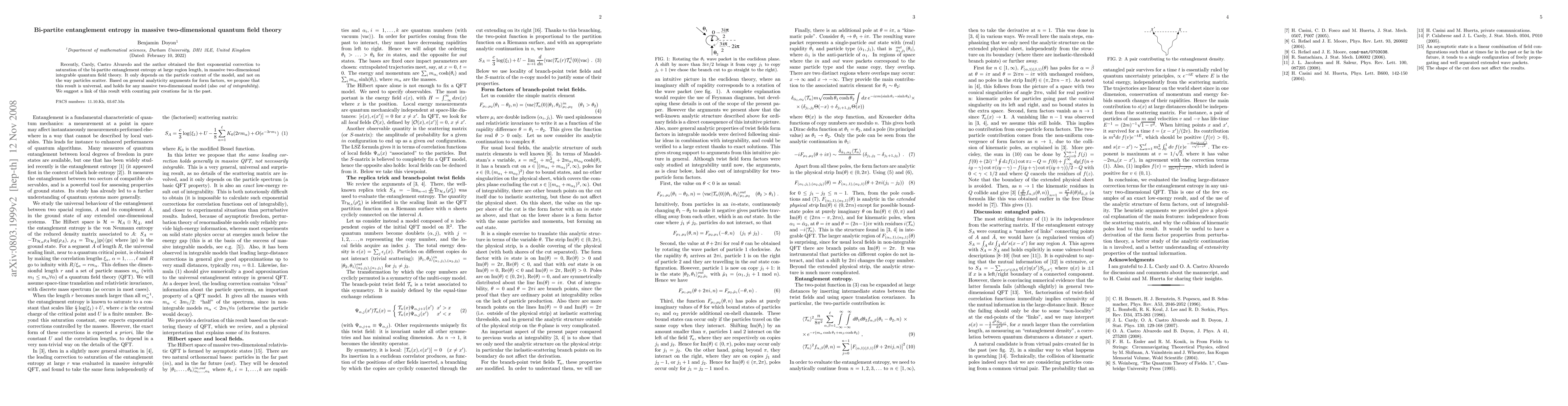 Recently, Cardy, Castro Alvaredo and the author obtained the first exponential correction to saturation of the bi-partite entanglement entropy at large region length, in massive two-dimensional integrable quantum field theory. It only depends on the particle content of the model, and not on the way particles scatter. Based on general analyticity arguments for form factors, we propose that this result is universal, and holds for any massive two-dimensional model (also out of integrability). We suggest a link of this result with counting pair creations far in the past.