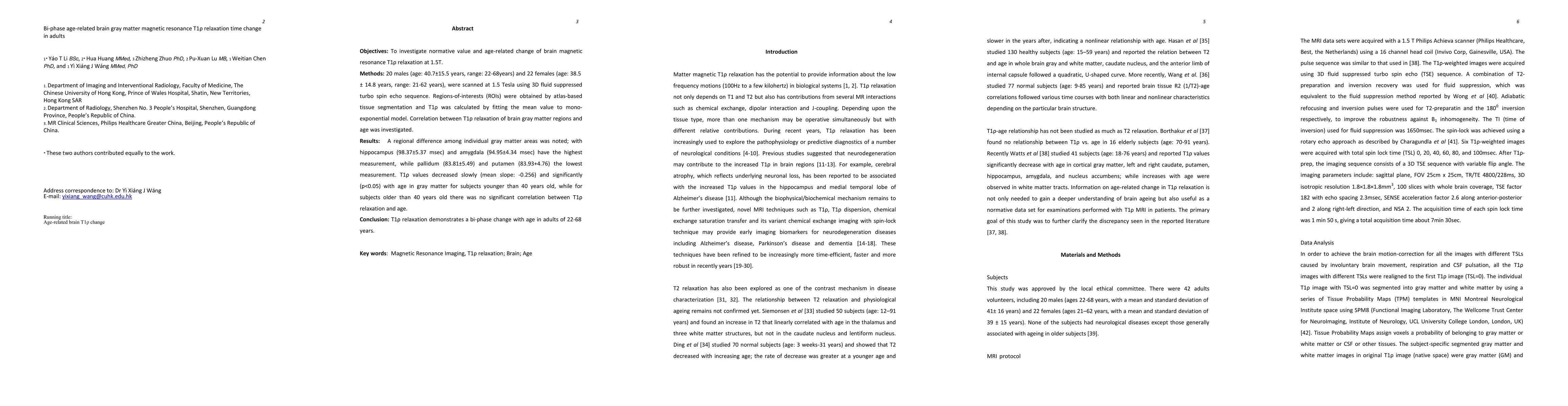 Objectives: To investigate normative value and age-related change of brain magnetic resonance T1rho relaxation at 1.5 T. Methods: 20 males (age: 40.7+/-15.5 years, range: 22-68 years) and 22 females (age: 38.5 +/-14.8 years, range: 21-62 years), were scanned at 1.5 Tesla using 3D fluid suppressed turbo spin echo sequence. Regions-of-interests (ROIs) were obtained by atlas-based tissue segmentation and T1rho was calculated by fitting the mean value to monoexponential model. Correlation between T1rho relaxation of brain gray matter regions and age was investigated. Results: A regional difference among individual gray matter areas was noted; with hippocampus (98.37+/-5.37 msec) and amygdala (94.95+/-4.34 msec) have the highest measurement, while pallidum (83.81+/-5.49) and putamen (83.93+4.76) the lowest measurement. T1rho values decreased slowly (mean slope: -0.256) and significantly (p<0.05) with age in gray matter for subjects younger than 40 years old, while for subjects older than 40 years old there was no significant correlation between T1rho relaxation and age. Conclusion: T1rho relaxation demonstrates a bi-phase change with age in adults of 22-68 years.