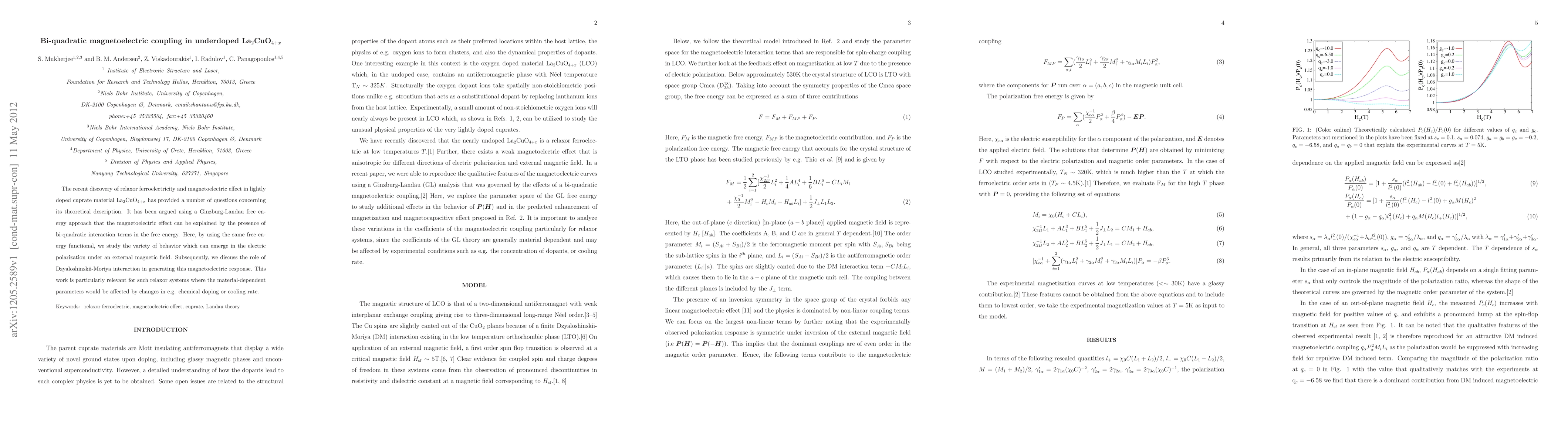 The recent discovery of relaxor ferroelectricity and magnetoelectric effect in lightly doped cuprate material La_2CuO_{4+x} has provided a number of questions concerning its theoretical description. It has been argued using a Ginzburg-Landau free energy approach that the magnetoelectric effect can be explained by the presence of bi-quadratic interaction terms in the free energy. Here, by using the same free energy functional, we study the variety of behavior which can emerge in the electric polarization under an external magnetic field. Subsequently, we discuss the role of Dzyaloshinskii-Moriya interaction in generating this magnetoelectric response. This work is particularly relevant for such relaxor systems where the material-dependent parameters would be affected by changes in e.g. chemical doping or cooling rate.