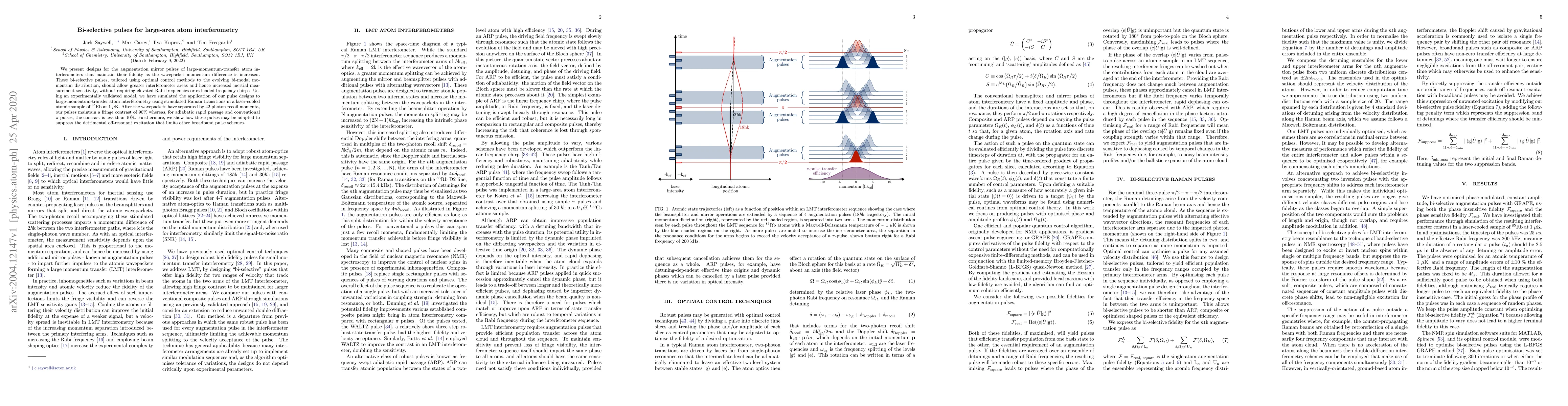 This paper introduces bi-selective pulses designed to enhance the fidelity of large-area atom interferometers, maintaining high fringe contrast even as wavepacket momentum differences increase. These pulses, optimized using control methods, improve measurement sensitivity without needing higher Rabi frequencies or extended chirps.