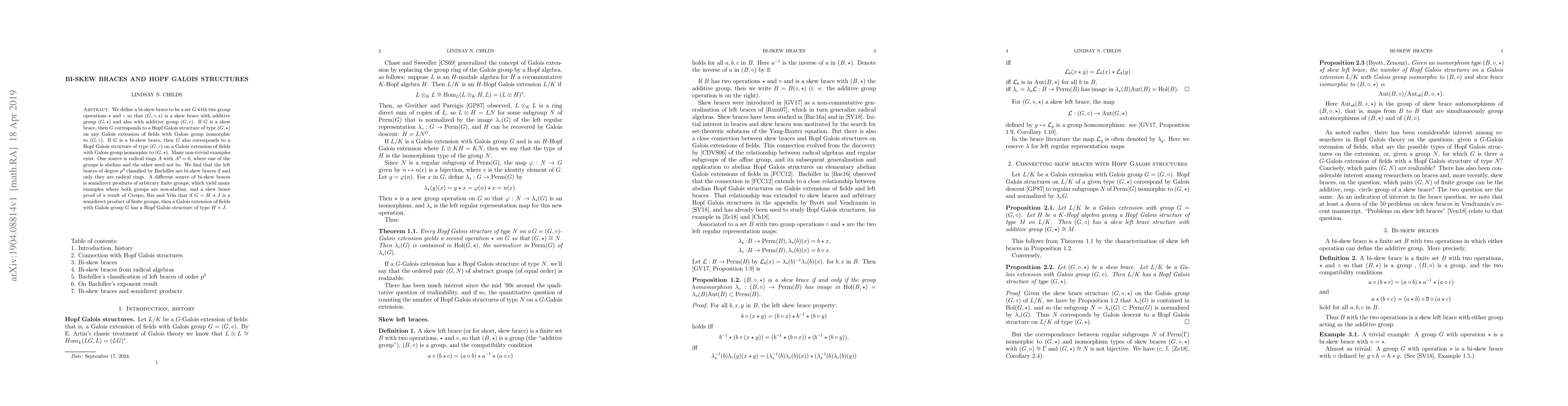 We define a bi-skew brace to be a set $G$ with two group operations $\star$ and $\circ$ so that $(G, \circ, \star)$ is a skew brace with additive group $(G, \star)$ and also with additive group $(G, \circ)$. If $G$ is a skew brace, then $G$ corresponds to a Hopf Galois structure of type $(G, \star)$ on any Galois extension of fields with Galois group isomorphic to $(G, \circ)$. If $G$ is a bi-skew brace, then $G$ also corresponds to a Hopf Galois structure of type $(G, \circ)$ on a Galois extension of fields with Galois group isomorphic to $(G, \star)$. Many non-trivial examples exist. One source is radical rings $A$ with $A^3 = 0$, where one of the groups is abelian and the other need not be. The left braces of degree $p^3$ classified by Bachiller are bi-skew braces if and only they are radical rings. A different source of bi-skew braces is semidirect products of arbitrary finite groups, which yield many examples where both groups are non-abelian, and a skew brace proof of a result of Crespo, Rio and Vela that if $G = H\rtimes J$ is a semidirect product of finite groups, then a Galois extension of fields with Galois group $G$ has a Hopf Galois structure of type $H \times J$.