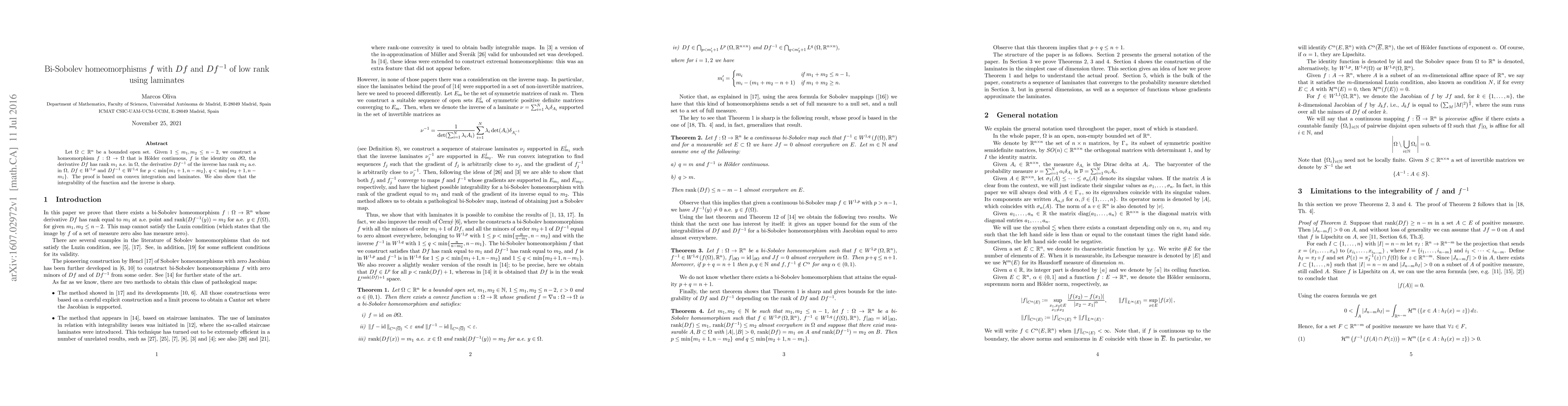 Let $\Omega\subset \mathbb{R}^{n}$ be a bounded open set. Given $1\leq m_1,m_2\leq n-2$, we construct a homeomorphism $f :\Omega\to \Omega$ that is H\"older continuous, $f$ is the identity on $\partial \Omega$, the derivative $D f$ has rank $m_1$ a.e.\ in $\Omega$, the derivative $D f^{-1}$ of the inverse has rank $m_2$ a.e.\ in $\Omega$, $Df\in W^{1,p}$ and $Df^{-1}\in W^{1,q}$ for $p<\min\{m_1+1,n-m_2\}$, $q<\min\{m_2+1,n-m_1\}$. The proof is based on convex integration and laminates. We also show that the integrability of the function and the inverse is sharp.